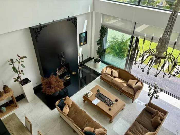 House for sale in Digomi 7. The area of the upper floor is 244 sq.m and the lower floor is 180 sq.m, plus an open semi-built balcony and a 55 sq.m basement. On the upper floor there are three bedrooms, a living room of 50 sq.m, a kitchen of 25 sq.m, an office of 24 sq.m, three toilets, and three fireplaces. On the lower floor, there is a bedroom with a toilet, a living room of 16 sq.m, two garages, a storage room with a fireplace, and a basement with a fireplace. The garage and storage area has a separate toilet, there is an additional toilet in the yard, and it is equipped with a covered barbecue area of 18 sq.m and a closed space for parking and washing the car. The yard is 1500 sq.m.