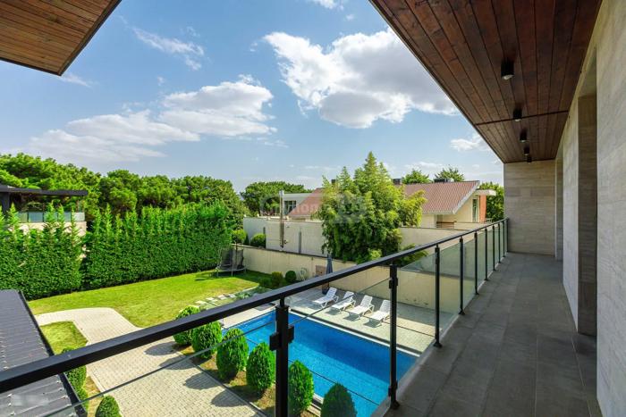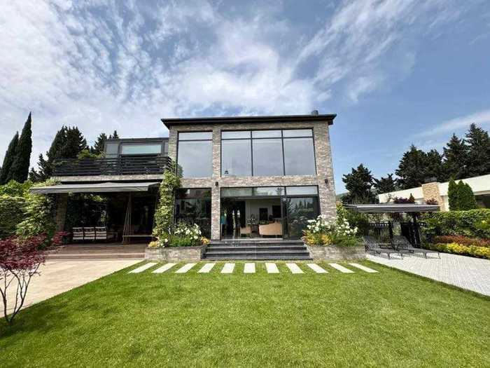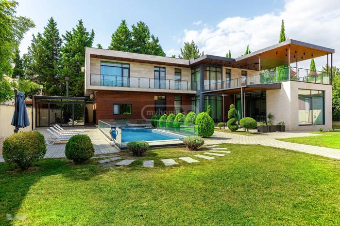 For sale: 2-story villa in Digomi 7 - in a quiet, elite neighborhood surrounded by pines, with a pool, entertainment space, and parking for 5 cars. House area - 500 sq.m land area - 1100 sq.m - 5 bedrooms (3 master bedrooms with walk-in closets and bathrooms) - 5 bathrooms - very large kitchen/dining room that turns into a summer space through sliding doors - large living room - 50 sq.m veranda - 30 sq.m patio (outdoor summer space) - pool (9X4) - 50 sq.m cellar with entertainment area and also a bathroom - parking for 5 cars