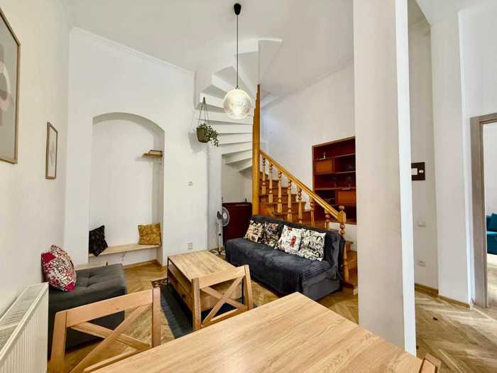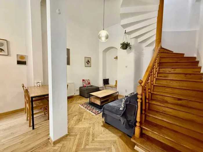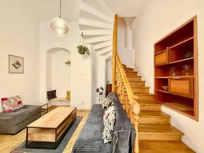 Two-story townhouse type residence in Sololaki A rare type of real estate in Sololaki - a two-story residence that combines the functions and layout of a townhouse with the architectural character of Old Tbilisi. Thick walls, high ceilings, arches, natural marble details (fireplace, staircase). 1st floor - living room, loggia, separate kitchen and toilet. Ceiling height - 3.2 m. 2nd floor - two bedrooms with private bathrooms, a study room, living space near the staircase, two small balconies - one facing the street, the other facing the yard (from Chonkadze Street onto the Tbilisi yard). Ceiling height - 3 m. Location • A separate standing residence - a rare comfort for Sololaki • 7 minutes drive from Freedom Square (750 m on foot, 1 km by car) • 150 meters from Amaghleba Street - shops, bakeries and cafes, pharmacies and various everyday spaces.