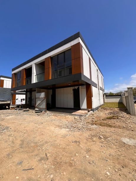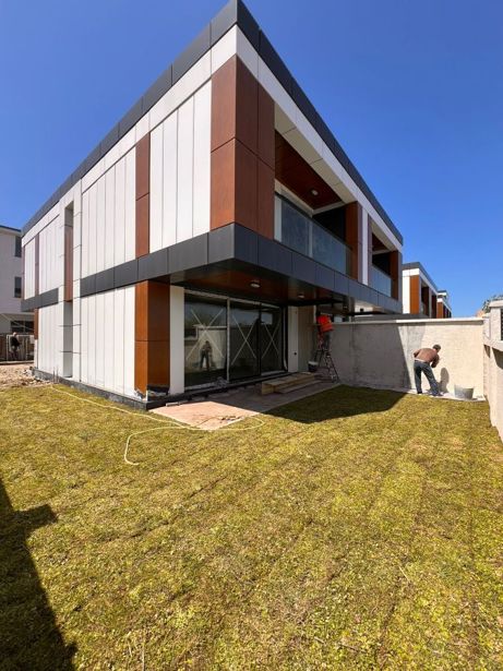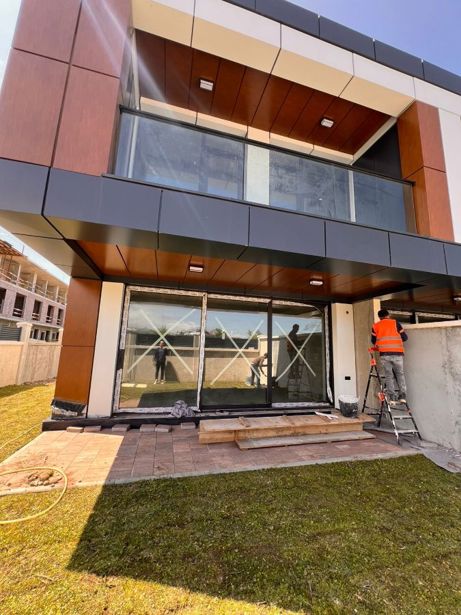 A house under construction is for sale in the Avgia settlement in Batumi, 800 meters from the Sarpi-Gonio highway, with panoramic views of the sea and mountains. The house will have a private decorated yard. The exterior facade features aluminum composite panels, aluminum window package frames and showcases, and glass railings.
