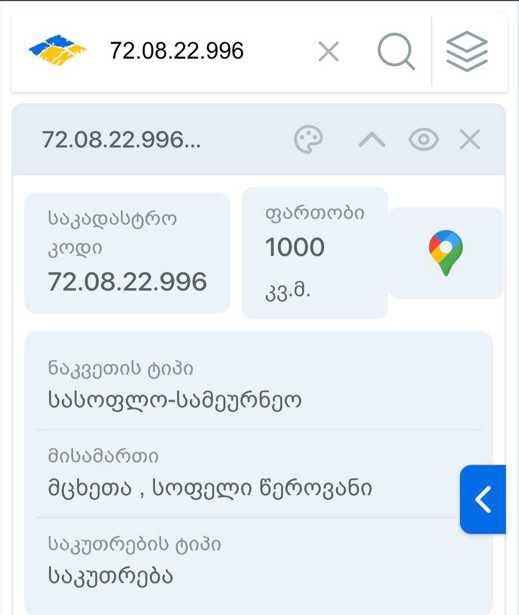 The plot is 1 kilometer from Svetitskhoveli. The price is negotiable.