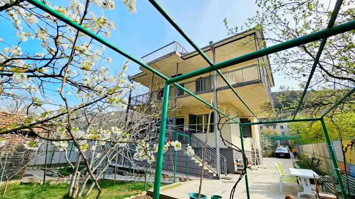 The house is 30 years old, 2 stories + attic and basement. With flat terrain in the yard. All utilities, the yard has fruit-bearing trees, vines, a spring, and a parking space.