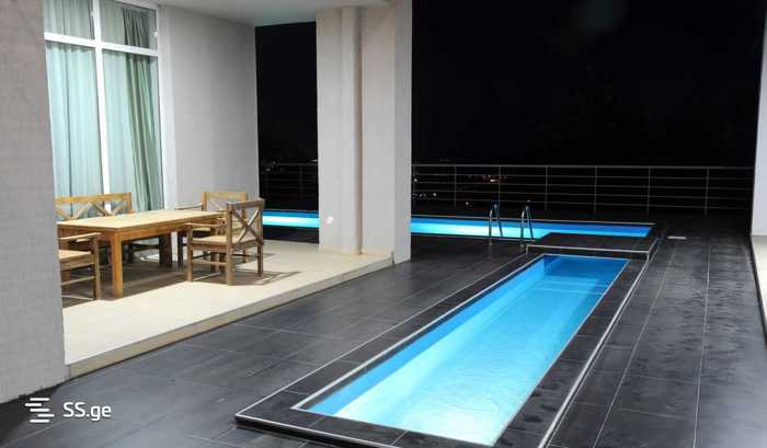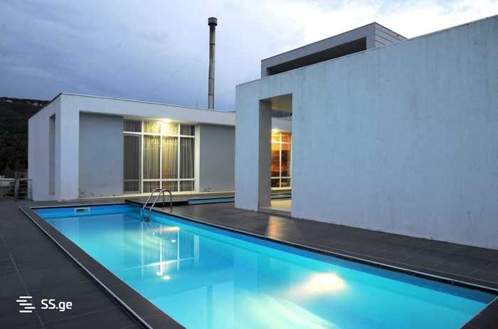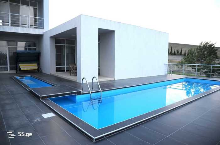 For rent in Tskhneti, near the center, a newly built ultramodern house with minimalist design and a large pool (9 km from Freedom Square, 15 minutes drive). The house is built and renovated with the highest quality European materials. The house is equipped with all kinds of technical means (kitchen, Dutch built-in gas fireplace, etc.). The house was put into operation in 2022. Land area: 1000 sq.m. Construction area 500 sq.m.