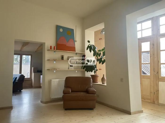 A unique apartment for sale in Old Tbilisi, on Leonidze Street, near Freedom Square, on the third floor of an old capital house. The apartment is very bright, spacious, with views, and high ceilings. The apartment has three bedrooms, three full bathrooms, Canadian oak parquet, fireplace, modern kitchen with Bosch appliances, two walk-in closets, air conditioning, central heating, hot water tank, and a veranda. The apartment will retain built-in wardrobes, appliances, dining tables, and beds. The price is 455,000 USD.
