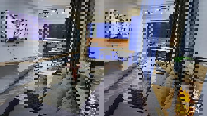 სამოთახიანი ბინა 1. ორი საძინებელი, 2. ორი სველი წერტილი, 3. სტუდიური ტიპის მისაღები და სამზარეულო ბინაში ჩატარებულია უმაღლესი ხარისხის რემონტი, რისთვისაც გამოყენებული იქნა გერმანული, ესპანური და იტალიური სამშენებლო მასალები. ბინა ღჭურვილია ყველა საჭირო კომუნიკაციით, საოჯახო ინვენტარით: გათბობა, კონდიცირება, ჩაშენებული გაზქურა, ტელევიზორი, მაცივარი, სარეცხი მანქანა, მიკროტალღური ღუმელი, ყავის აპარატი, წყლის მადუღარა, მტვერსასრუტი და სხვა ტექნიკა ... ავეჯი: საძინებლები ქარხნულად დამზადებული და ჩამოტანილი თურქეთიდან. სამზარეულო შეღებილი MDF, სხვა დანარჩენი ავეჯი დამზადებული უმაღლესი ხარისხის მასალისგან, ასევე, აივნისთვის შეძენილი და დამზადებულია რეკრეაციული და კლიმატური პირობებისთვის შესაბამისი ავეჯი. დიდი, პანორამული აივნით და საუკეთესო ხედებით მთელს ქალაქზე. ავტო პარკინგით ერთ ავტომობილზე. პარკინგზე განთავსებული ინდივიდუალური შესანახი საკუჭნაოკარადა ე.წ. " Locker" (თხილამურების, ველოსიპედის ან სხვა ნივთების და ხელსაწყოების შესანახად)