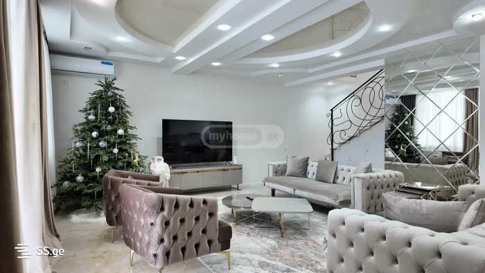 For sale: a 9-room house with an area of 245 sq.m. near Tbilisi Sea with beautiful views, newly renovated, furnished and equipped, with a garden of 450 sq.m. The house is energy-efficient. The house has a large living room (60 sq.m) and an isolated dining room.