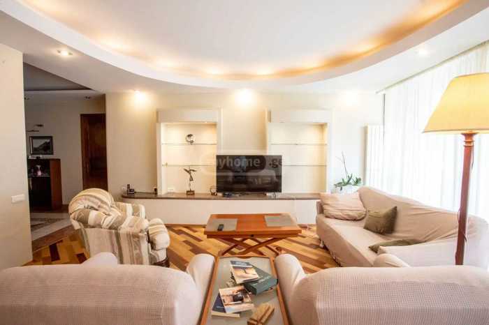For sale 5-room apartment in Vake, on Ateni Street. Total area - 200 m2. Isolated kitchen-living room, 3 bedrooms, basement room, and garage. Price - 412,000 USD.