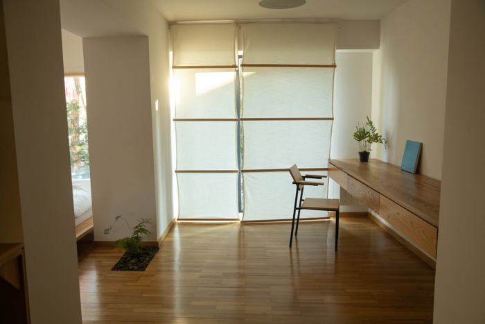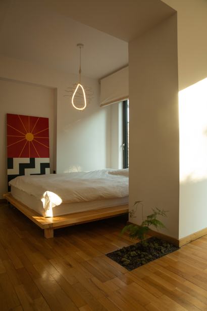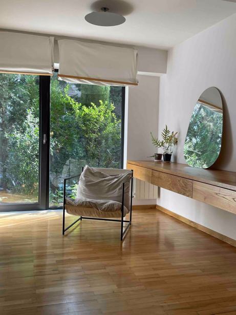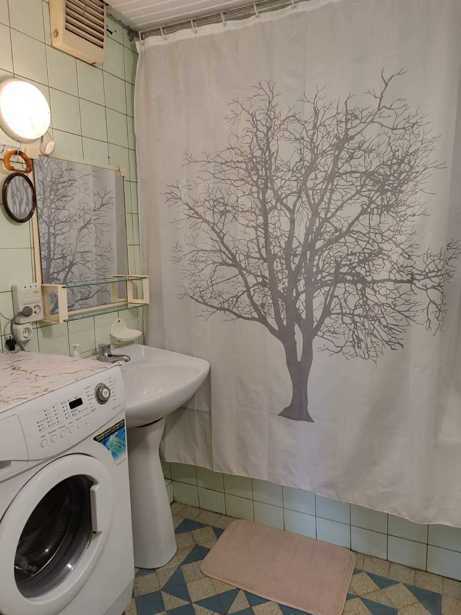 A non-standard 50 square meter studio-type apartment is available for rent on the high first floor (2-2.5 meters above ground), furnished with handmade furniture and accessories, equipped with all necessary appliances and household items for living. The apartment is located in a green, quiet neighborhood, 5 minutes away from two metro stops, 2-3 minutes away from bus stops, surrounded by various shops, cafes, and close to City Mall (10 min walk).