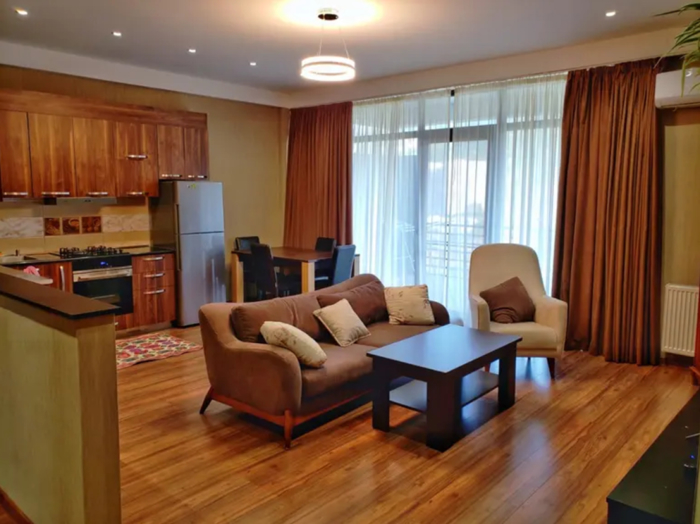 ქირავდება ბინა – 63 კვ.მ ქირავდება 63 კვმ ბინა, რომელიც მდებარეობს ძალიან მშვიდ და გამორჩეულ უბანში. ადგილი არის წყნარი და კომფორტული, ამასთანავე ქალაქის ცენტრამდე მანქანით რამდენიმე წუთში არის შესაძლებელი მისვლა, ახლოს მდებარეობს საზოგადოებრივი ტრანსპორტის გაჩერება. ბინა მდებარეობს პირველ სართულზე და აქვს პატარა კერძო ბაღი წინა მხარეს, რომელიც ბინის ნაწილია. ბინას აქვს ორი შესასვლელი — ერთი ბაღიდან, ხოლო მეორე სადარბაზოდან . ბინის განლაგება მოიცავს: ერთ საძინებელს ასევე მეორე ოთახს, რომელიც იდეალურია როგორც სამუშაო ოთახი / ოფისი. სრულად აღჭურვილ სამზარეულოს, სადაც არის სარეცხი მანქანა, ჭურჭლის სარეცხი მანქანა და მაცივარი Apartment for Rent – 63 sqm This 63-square-meter apartment is located in a very quiet and excellent neighborhood, offering a peaceful living environment while still being well connected. The city center can be reached within a few minutes by car, and public transportation is close by. The apartment is situated on the first floor and features a small private garden in front, which is part of the apartment and can be accessed directly. There are two entrances: one from the garden and another from the staircase (stairwell / building entrance). The layout includes: One bedroom A second room, ideal as a home office or study Fully equipped kitchen with washing machine, dishwasher, and refrigerator. The neighborhood is calm, green, and very pleasant — an ideal place to live.