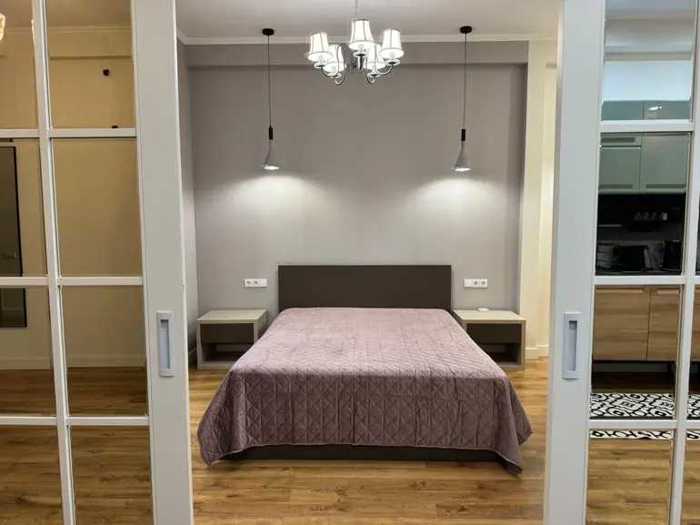 A renovated, cozy 2-room studio-type apartment for rent, with a separate bedroom, fully equipped with household appliances and furniture, in a newly built building located on Amirejibi Highway, adjacent to Mziuri Park.