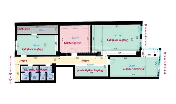 Office space for rent in a prestigious business center "Atrium" Workspace 1 - 19.8 m² Workspace 2 - 34.1 m² Workspace 3 - 26.6 m² Open workspace (in the hallway) - 9.2 m² Kitchen - 20.3 m² Storage - 8.7 m²