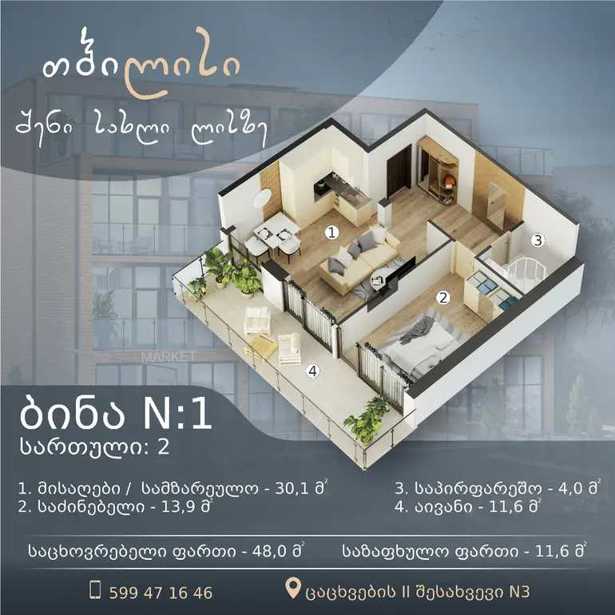 For sale is a 59.6 m2 newly constructed apartment in Tbilisi, on Tsitsishvili Street. This modern residence offers comfortable living in one of the capital's most promising neighborhoods. The apartment is located in a newly built building, ensuring a quiet and safe environment. If interested, please contact me at the number indicated in the ad.