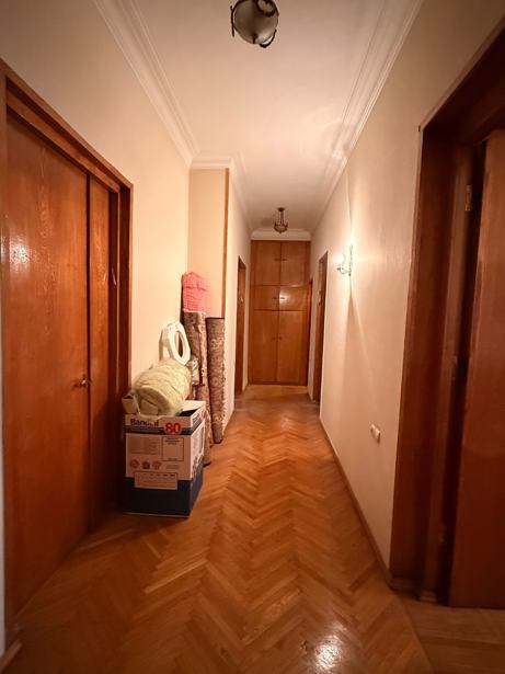 |For sale near the round garden, designer, beautiful, high-ceilinged corner apartment. With new renovations, made with high-quality materials, and premium class appliances. Central heating, 2 air conditioners, wooden parquet. The kitchen has a mix of antique furniture and solid oak furniture made by 'Casa Verde'. The same material has been used for the library shelves and bathroom furniture. The apartment has three bedrooms, 2 of which have their own closets, and 1 bedroom has a large built-in wardrobe. The apartment is equipped with internet and television in every room. 2 balconies, 2 bathrooms, basement, and a storage room in the entrance. The yard is closed with a barrier and there is a parking space. Secure entrance, 2 elevators - cargo and passenger. The apartment has registered free parking in Tbilisi for 2 cars.