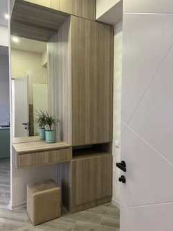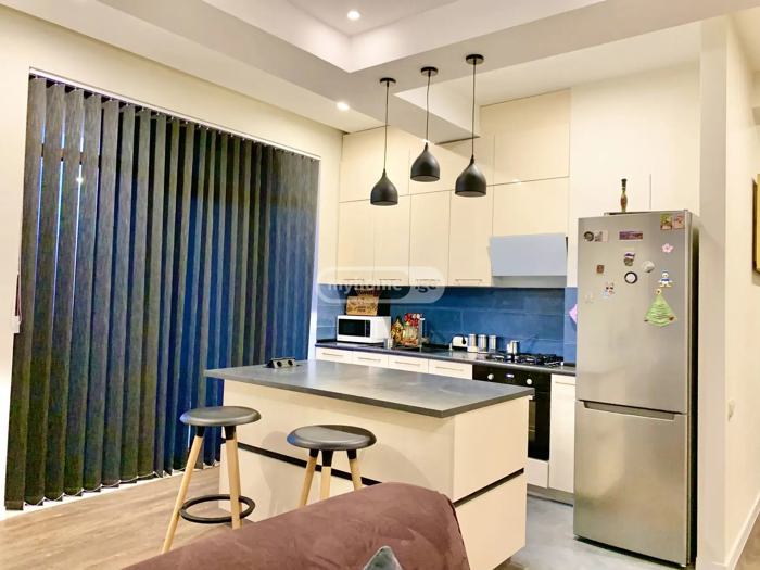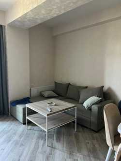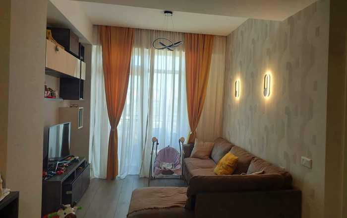 A studio-type, renovated apartment with partial furniture and appliances is for sale in a newly built building. It has 2 bedrooms, one of which has secondary lighting.
