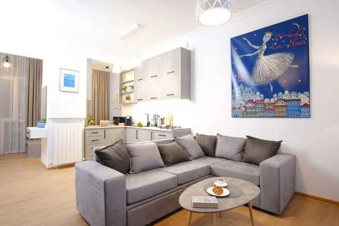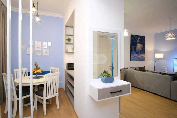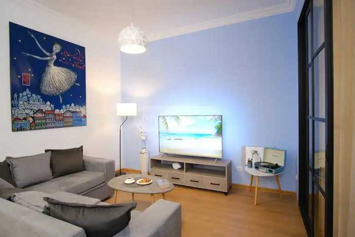 In Old Tbilisi, Mtatsminda, Sololak, Amaglebi Street, 2-room apartment for rent for 6 months, equipped with all the necessary equipment, the apartment has a French balcony, perfect renovation, central heating, complete furniture and appliances, the building is served by the reception, the entire external and internal perimeter is controlled. The apartment has a washing machine, TV with air conditioner, central heating with microwave oven, iron, hair dryer, electric kettle. and other necessary inventory.