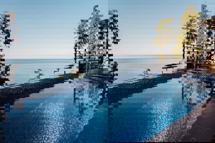 A house under construction is for sale in the Avgia settlement in Batumi, 800 meters from the Sarpi-Gonio highway, with panoramic views of the sea and mountains. The house will have a private decorated yard. The exterior facade features aluminum composite panels, aluminum window package frames and showcases, and glass railings.