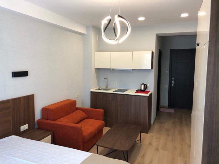 For rent monthly, a one-room studio-type spacious and bright apartment at 124 Agmashenebeli, fully furnished with all necessary inventory: bathroom, kitchen, balcony, fireplace. The room has one double bed and one single bed, as well as a sofa. The price is $470. This price includes utility expenses.