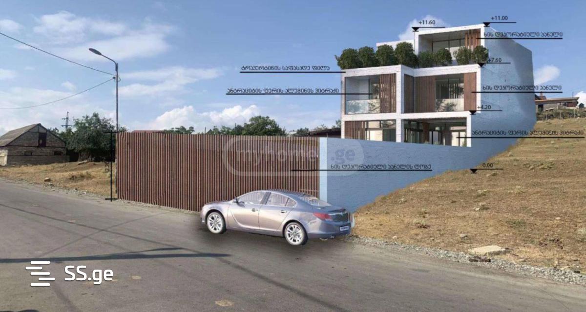 A plot of land for sale in Tabakhmela, 500 m2 in a populated area with an agreed 3-storey house project. Electricity is 10 meters from the land, gas is 35 meters away, and water is 15 meters away. An individual house project has been agreed on the plot of land, which is clearly visible in the photographs. An asphalt road leads to the plot. It is possible to trace and start construction immediately after purchase.
