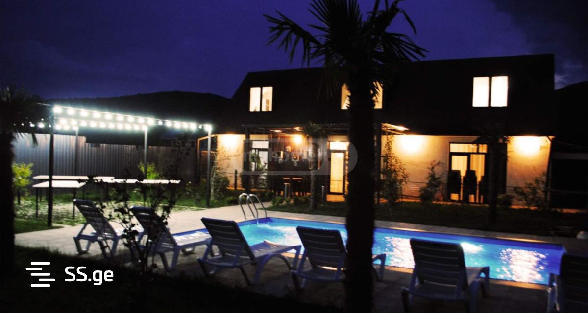 ქირავდება დღიურად ახალაშენებული ორსართულიანი სახლი აუზით.ეზოს ფართი 1100კვ.მ. ასევე ამ სივრცეში დგას 120 კვ.მ დამოუკიდებელი შენობა(მისაღები,კლუბი,ჰოლი)ევრო რემონტით,ცენტრალური გათბობით,ვერანდით(30 კვ.მ)პარკინგით და კარგი ხედით.ტექნიკა:სარეცხის მანქანა,ჭუეჭლის სარეცხი მანქანა,მძლავრი ,,დინამიკი,,(sony)ეზოს განათება ,,გირლიანდები,,დიდი და პატარა მაყალი(გრილი )შამფურები