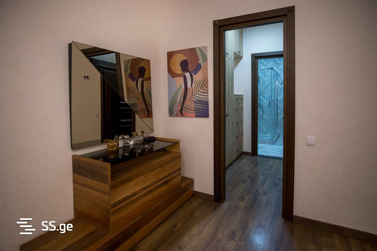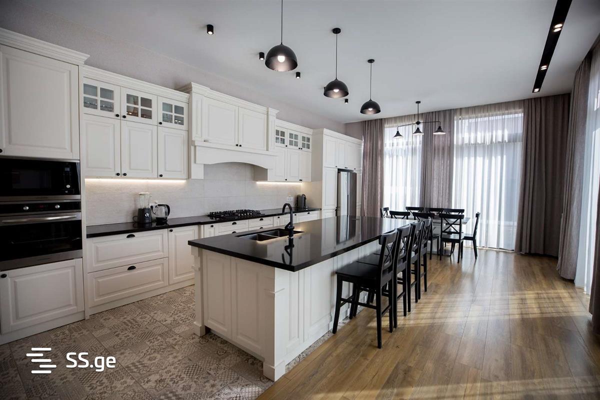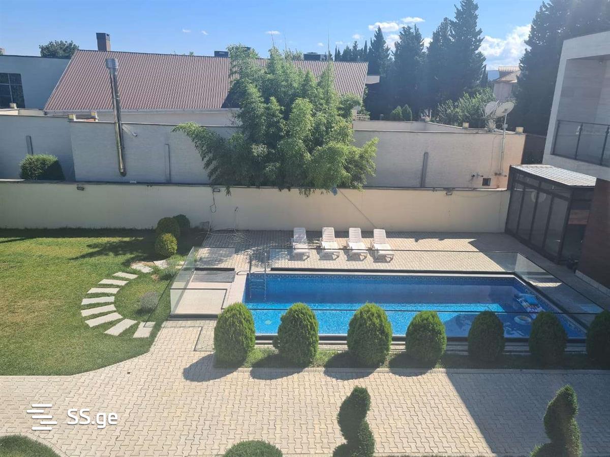 A modern villa for rent in Digomi 7, with the latest design and a beautiful yard. First floor: large living room (50 sq.m.), large isolated kitchen (50 sq.m.), office, bedroom with dressing room, large bathroom with jacuzzi, laundry room, pantry, boiler. Second floor: kitchen (so-called kitchenette), 3 large bedrooms, each with its own With bathrooms and dressing rooms, 20 square meters of balconies and large verandas (50 sq.m.), parking for 5 cars is arranged in the yard. The house has a pool and sunbathing area, a cellar and a recreation area (60 sq. m), a yard decorated with green leylands and cypresses, an aviary. For more information, call me at