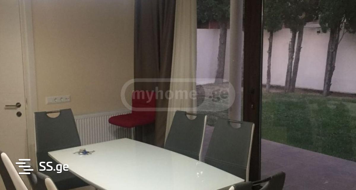 A 2-storey, 250 sq m residential house is for rent at Digomi 7, Pimen Kurashvili Street. On the first floor: living room, independent kitchen (equipped with household appliances), bedroom, technical/laundry room, bathroom. On the second floor: 3 bedrooms (two master bedrooms), 3 bathrooms (for the third bedroom). All rooms have air conditioning. There is furniture in the house. The house has a garage. The area of the yard is 664 sq.m