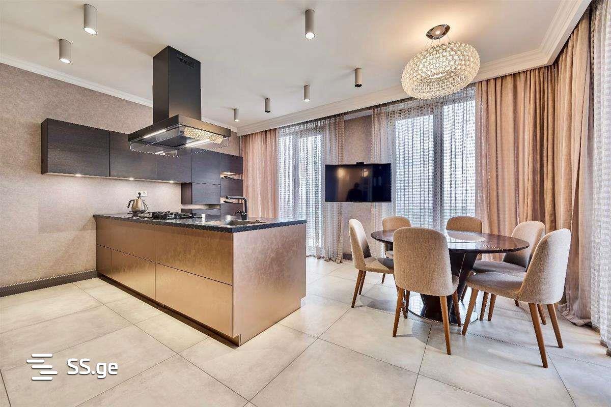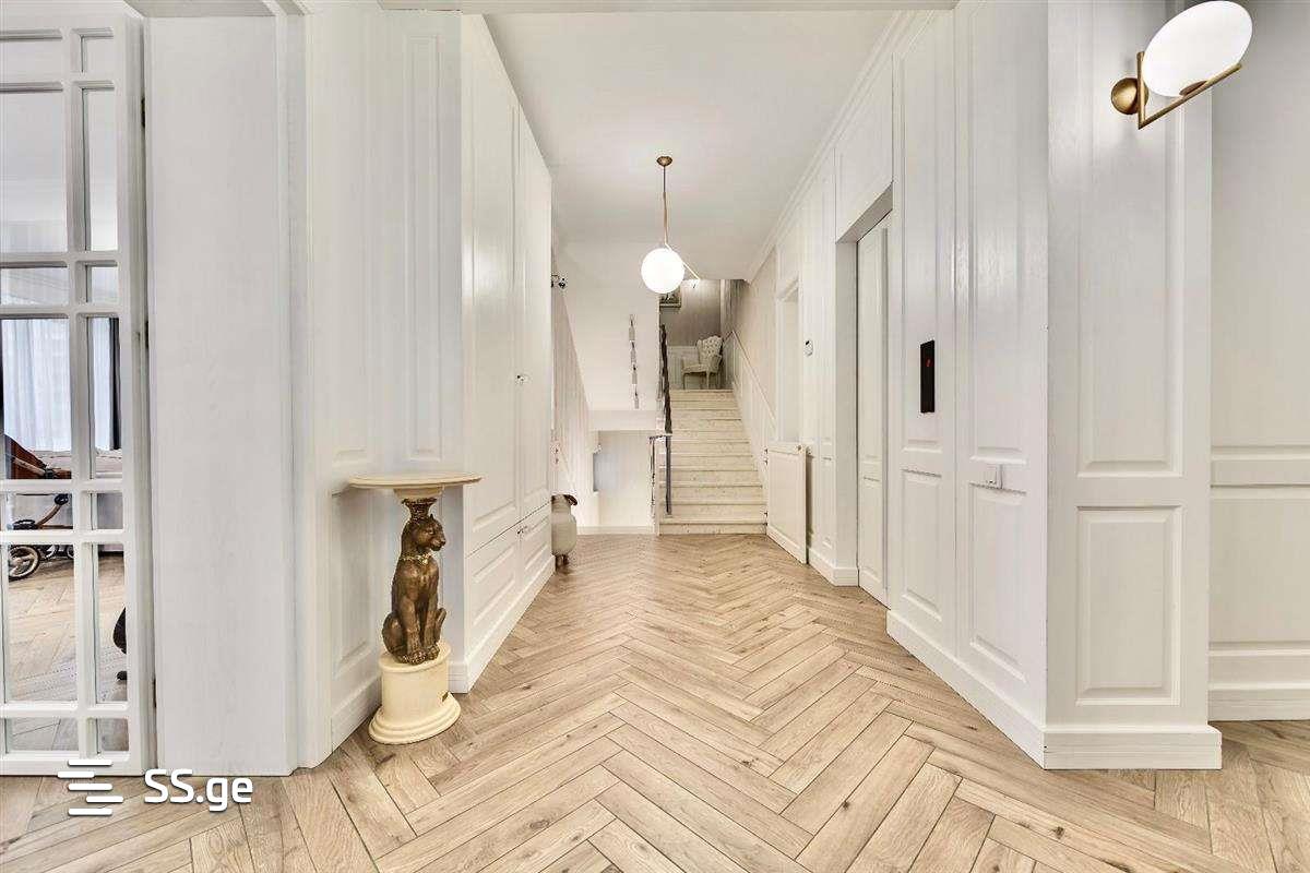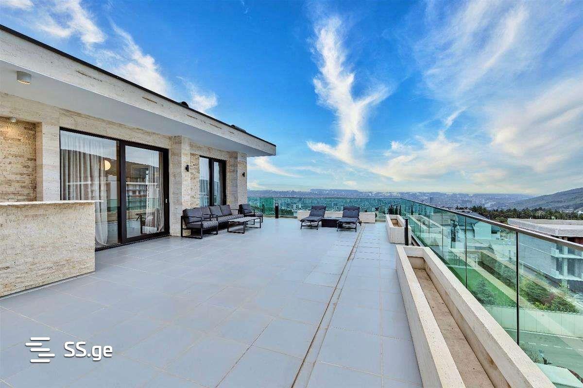 For rent, newly built 500 sq.m. Duplex apartment (the last 2 floors of a 5-story building) Krtsanisi Villa, in the residential complex of Krtsanisi Villa Residence, with an isolated entrance, the elevator goes directly to the house. Living space 280 sq.m. Terrace and balconies 220 sq.m. There are 7 rooms, of which 3 bedrooms (all three with their own bathrooms, including 2 with their own wardrobes), 1 office (can also serve as a full 4th bedroom), 1 large living room (62 sq. m.), 1 large kitchen room and 1 laundry and Ironing room. The apartment has a total of 5 bathrooms and 2 large halls. The apartment has panoramic views, as balconies and terraces on both floors surround the building in 360 degrees. The apartment has been fully renovated with high class (Luxury) renovation, exclusive design, and it is fully furnished with high quality, luxury, branded furniture and appliances. The house has 2 garages. The building has a large isolated yard with greenery and a pool. Both the building and the entire area are provided with 24/7 security.