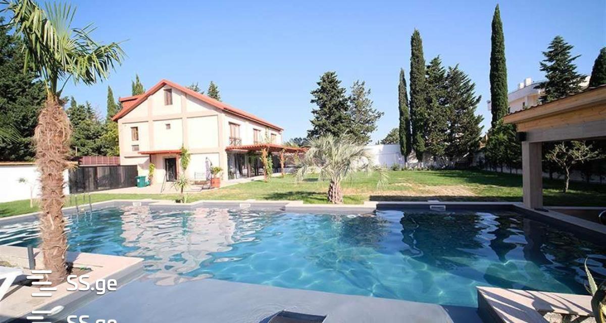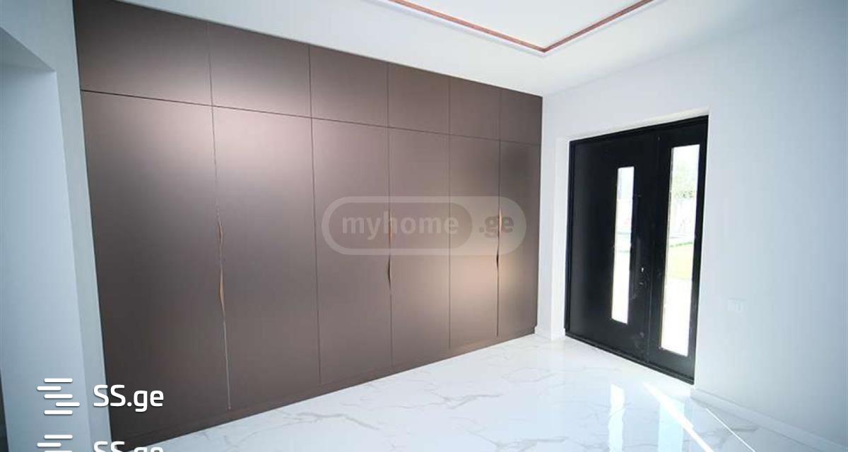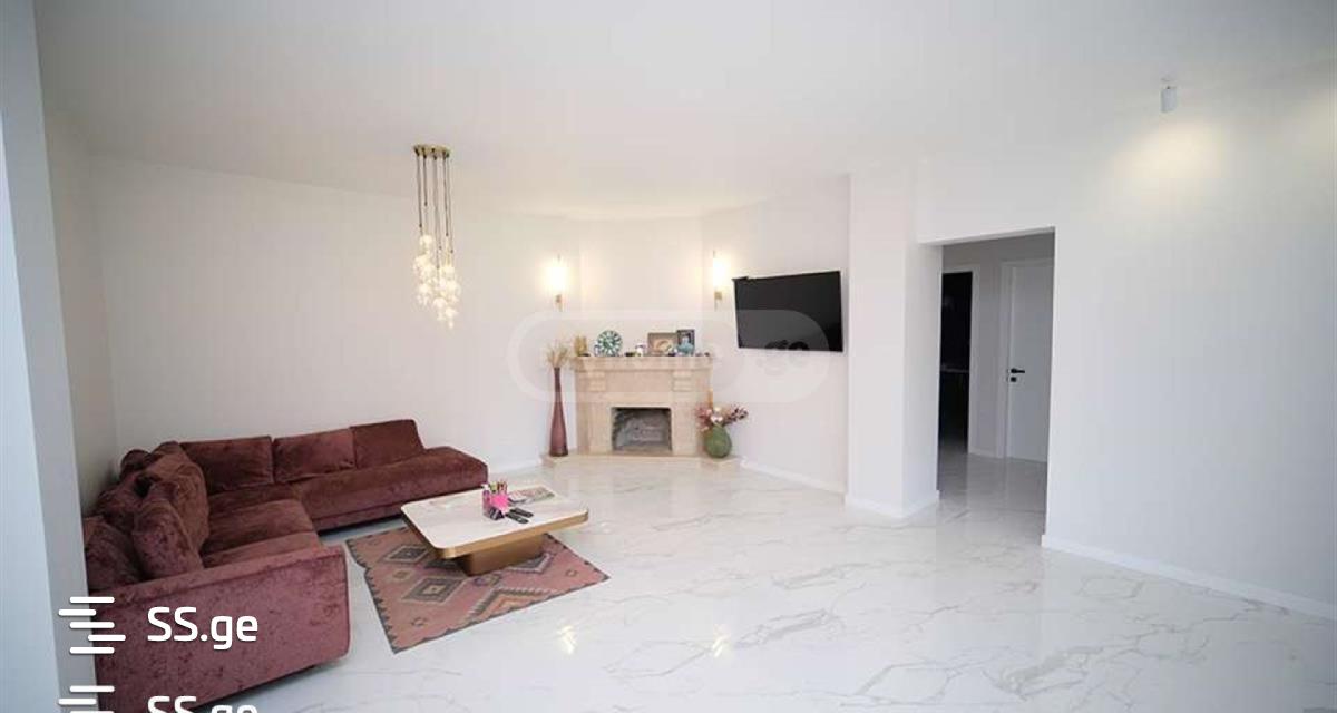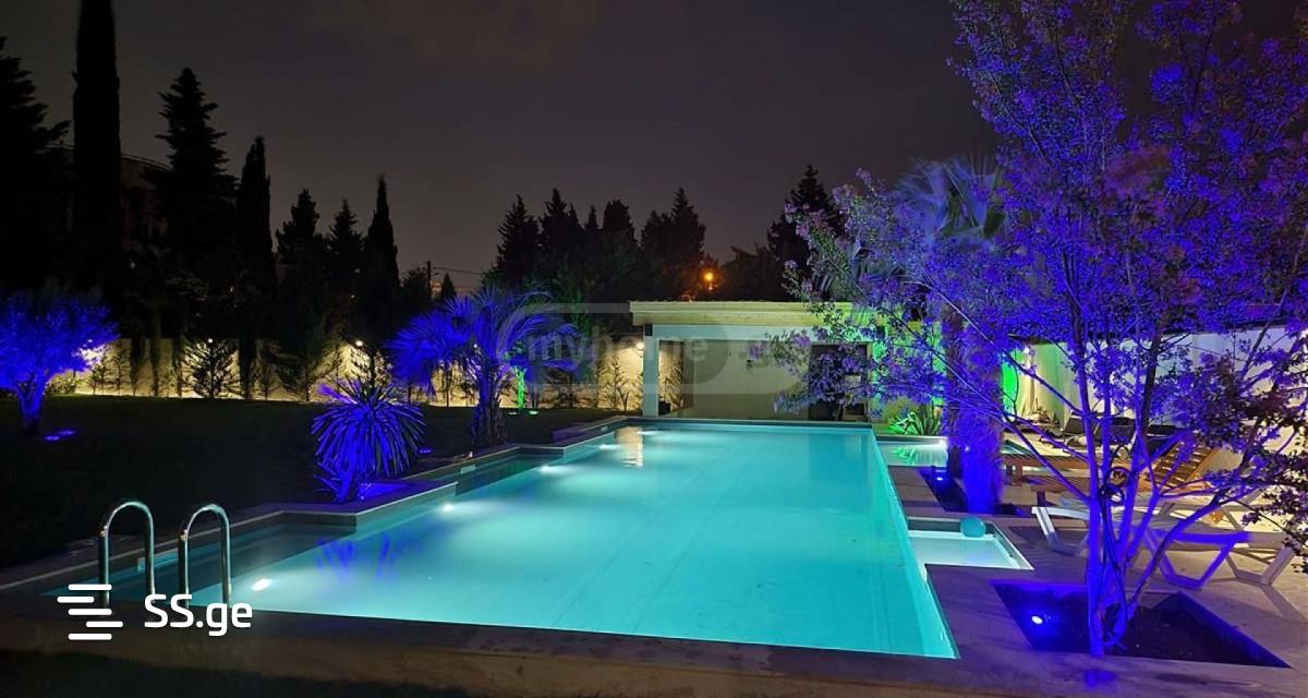 Modern style house at Digomi 7. Built in 2019, renovation completed in 2021. Total area: 500 m2. Of this, the living area is: 400 m2. comprising the following layout: Ground floor: Kitchen with dining area of stained glass type. Large living room and fireplace room. 2 bathrooms and 1 technical room. Hall with large built-in wardrobes. Open terrace 25 m2. On the second floor: a large living room. 4 bedrooms, including 1 master bedroom with walk-in closet. The remaining 3 bedrooms all have their own bathrooms. French balconies. The third floor is mansard type, there is a large office, a training room with its own bathroom. On the first floor, a high-quality renovation has been made, a color scheme decided in a modern design. It is of stained glass type, stained glass windows of aluminum slide systems are installed. Video cameras on the full perimeter. Total yard area: up to 1226 square meters. Fenced with a block fence. with a pulverized gate. Greening made with its own automatic irrigation system. A rare ornamental tree