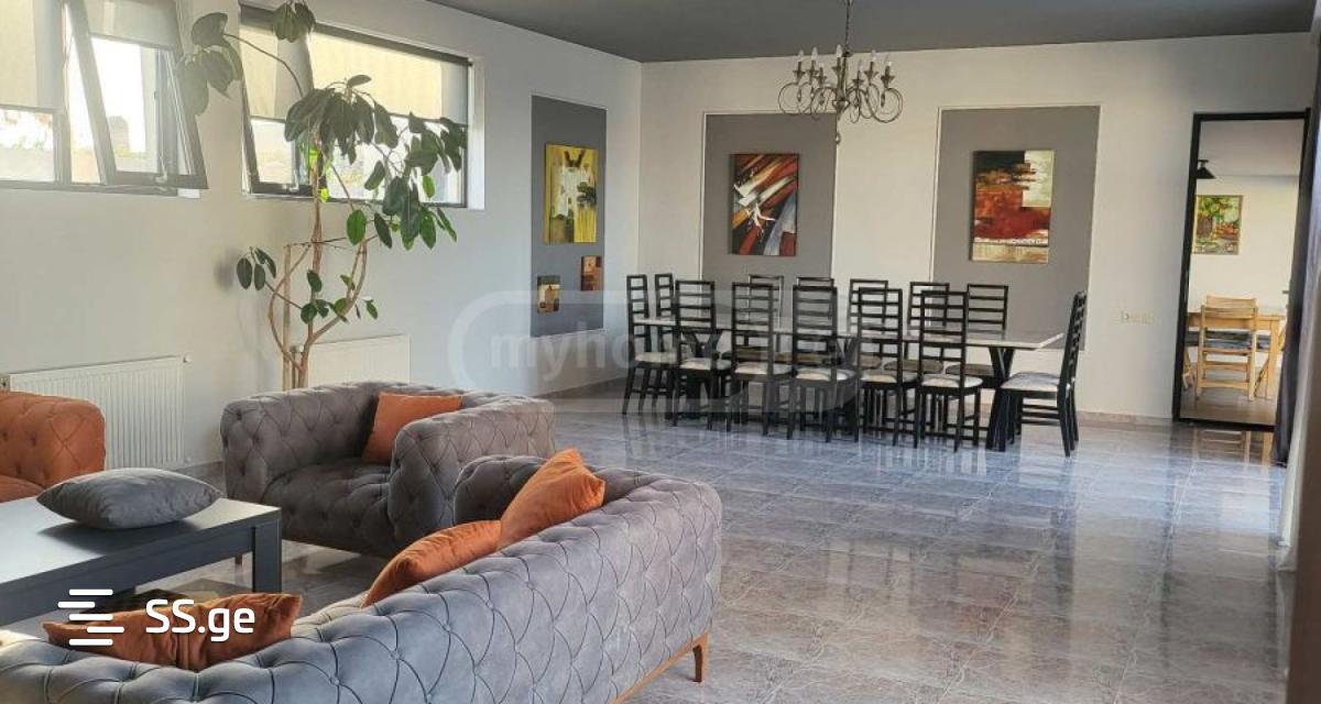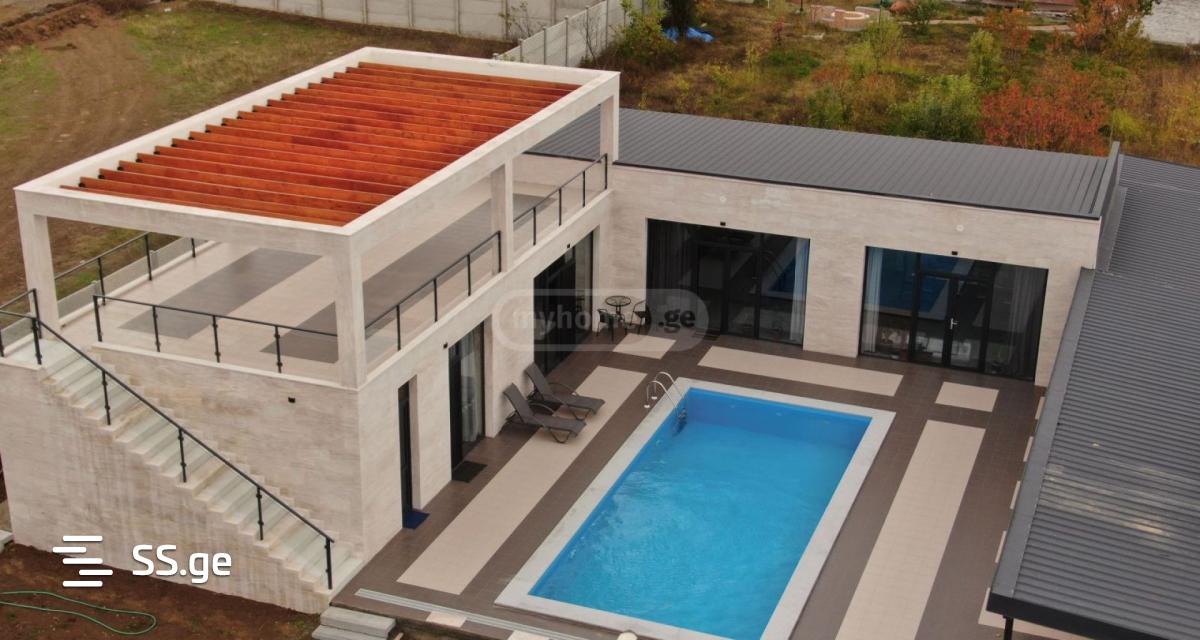 A newly built, travertine-clad, fashionable house in the best location in Saguramo is for sale. (with 360-degree views) with high-quality stained-glass windows and energy-efficient glass.living room 70m2; isolated kitchen 36m2; 4 bedrooms; 4 St. (with 2 master bedrooms) balcony 46m2; terrace 72m2; with all necessary communications.Pool 5*10 with filtration.1200m2 decorative and fruit tree yard.