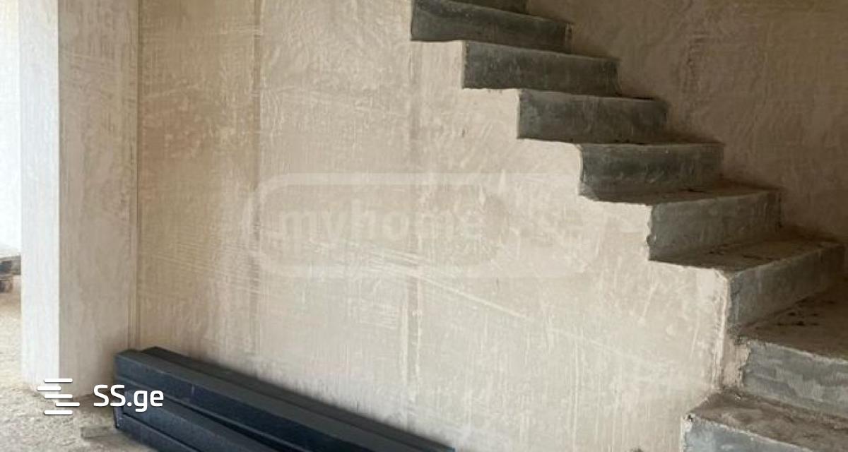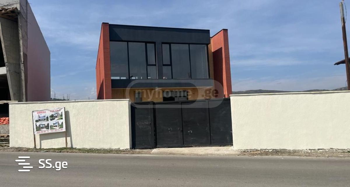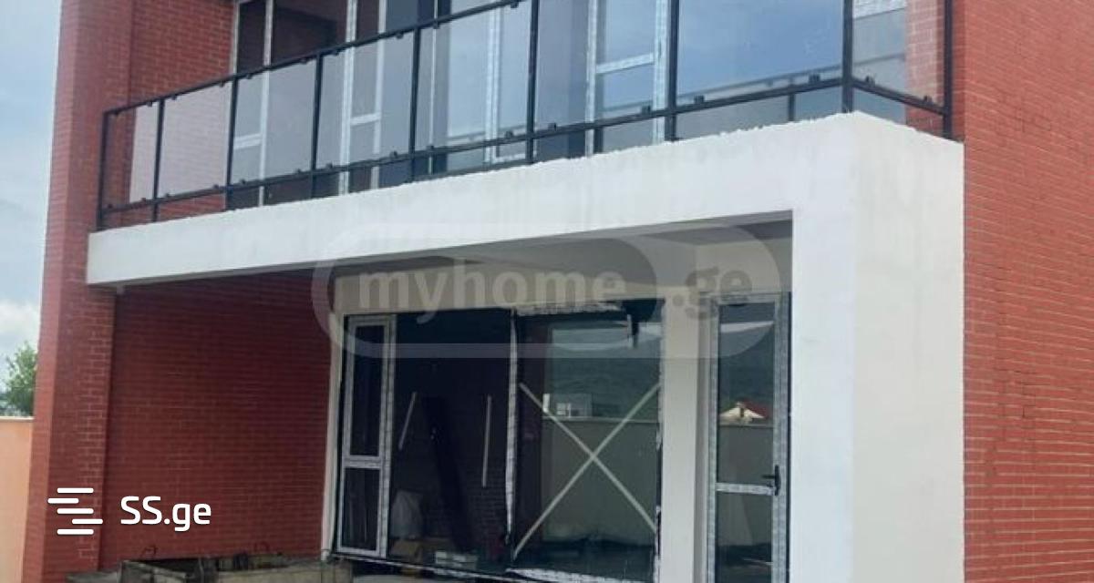 A newly built private house is for sale in the center of Tkhinvala, with a white frame, aluminum windows, a slide, a finished yard and a paved fence.