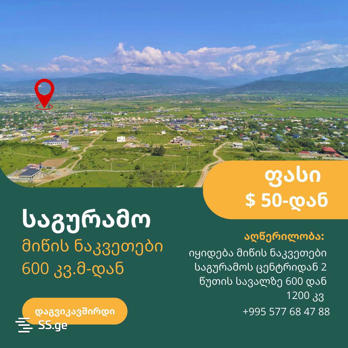 იყიდება 𝟖𝟎𝟎-დან 𝟏𝟐𝟎𝟎 კვ.მ-დე მიწის ნაკვეთი საგურამოში, ახალ მშენებარე უბანში. ირგვლივ მიმდინარეობს აქტიური განაშენიანება! ექსკლუზიური ფასად! მშენებლობის უფლებით! ნაკვეთი უშუალოდ საგურამოშია, არ ეკუთვნის მიმდებარე სოფლებს. ცენტრიდან 2-3 წუთის სავალზე. ნაკვეთი ჩვენი საკუთრებაა, არ წარმოვადგენთ სააგენტოს და გთხოვთ მაკლერები ნუ დაგვიკავშრდებით!