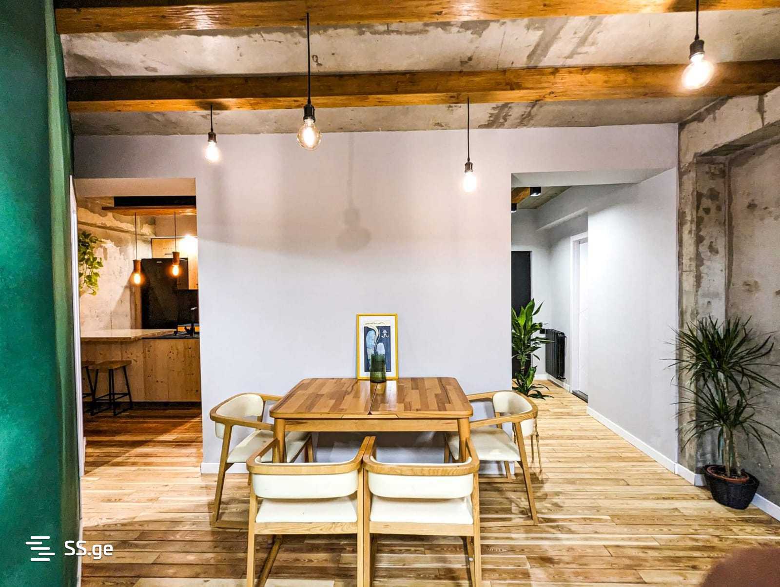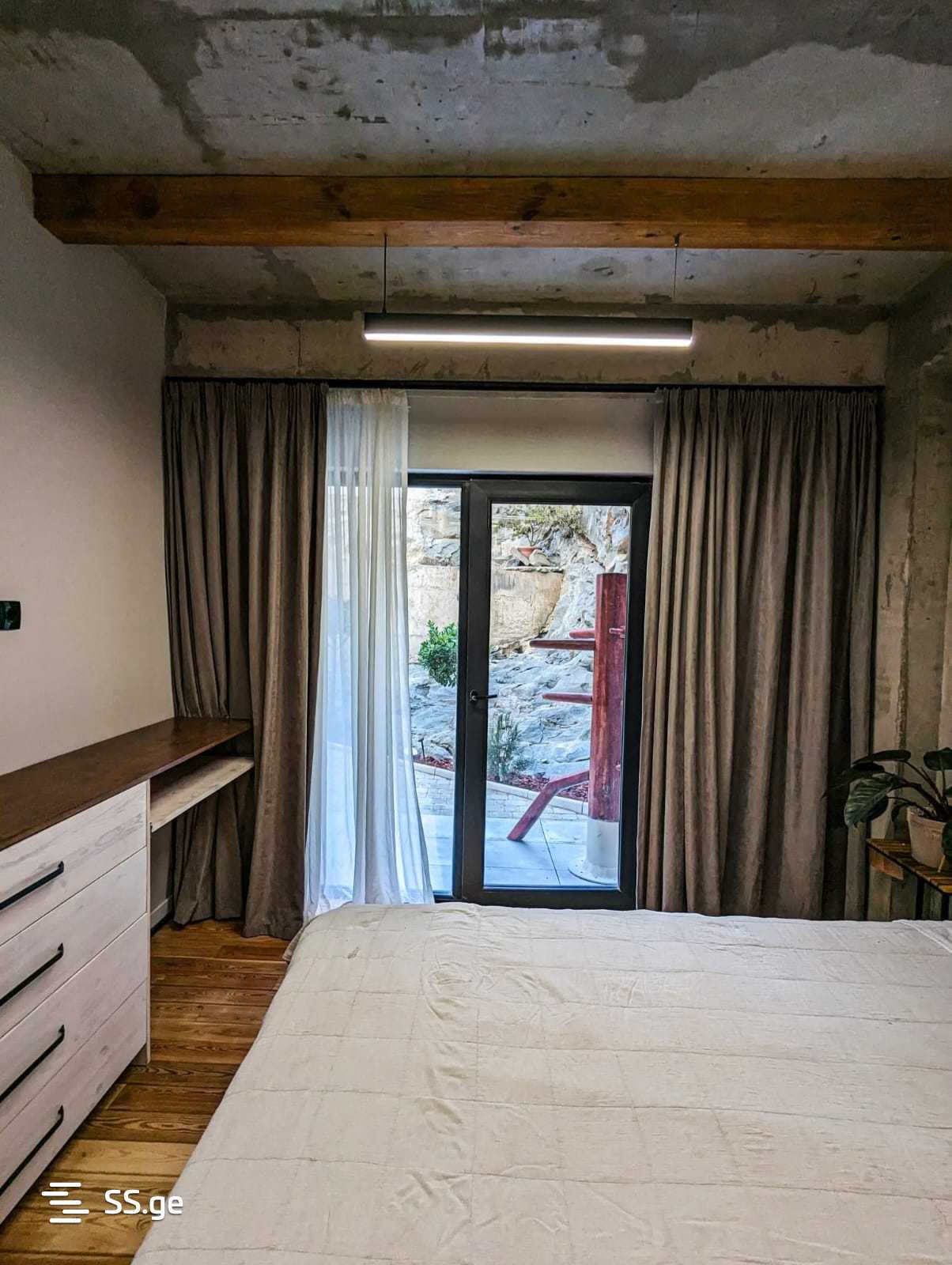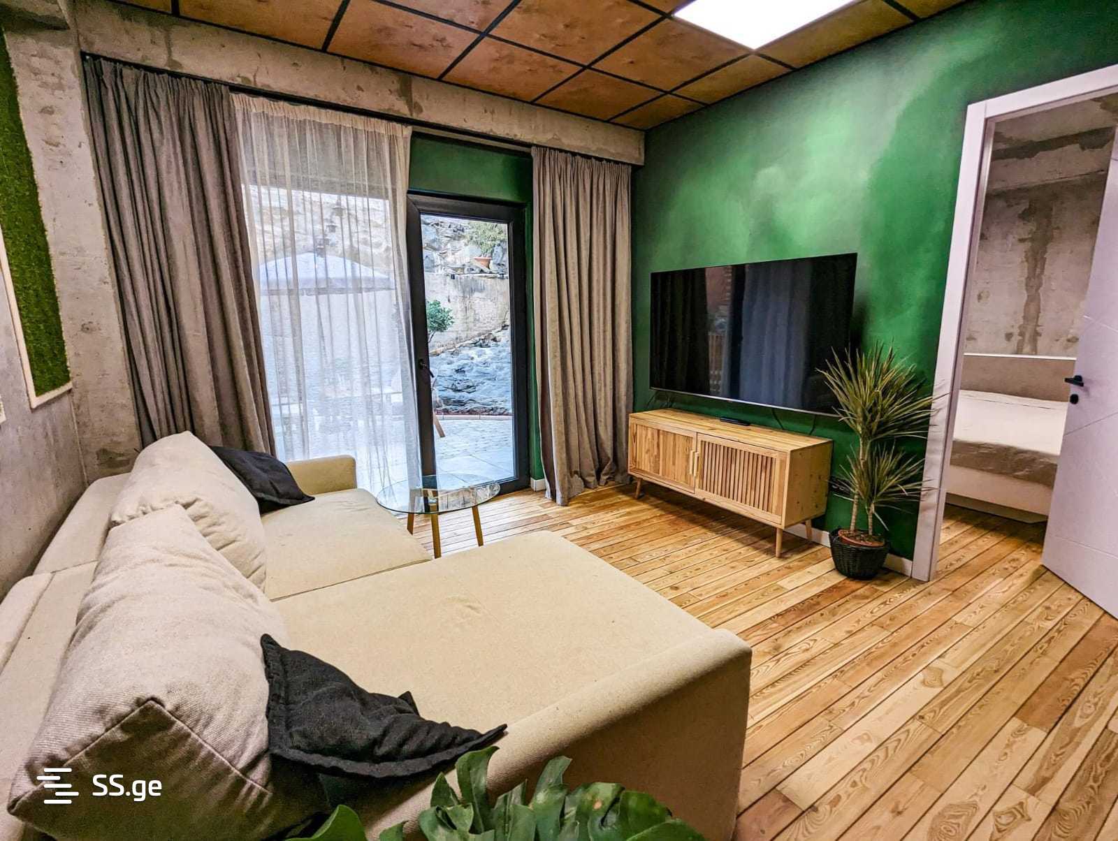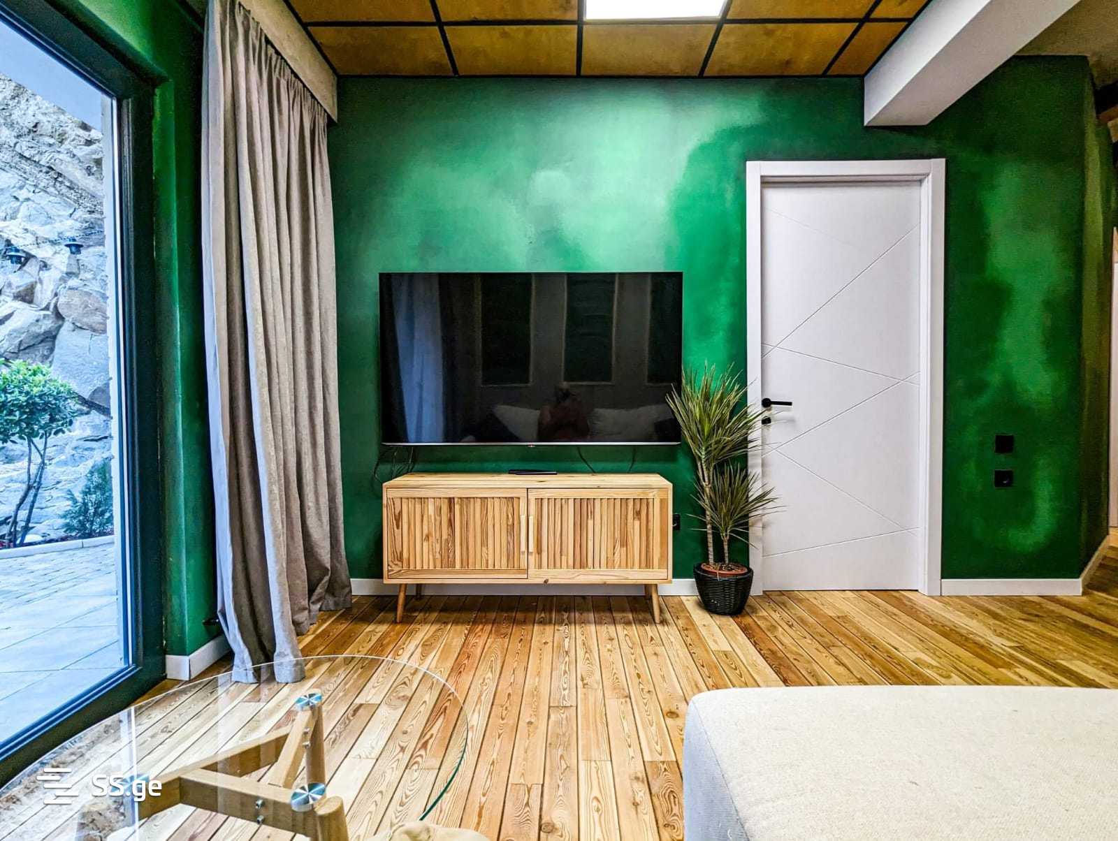 2. მისაღები, საერთო ოთახი - კომფორტერის გასაშლელი დივანი, ხის მაგიდა სკამები, 4K გამოსახულების 75D ტელევიზორი + ხის ტუმბო;