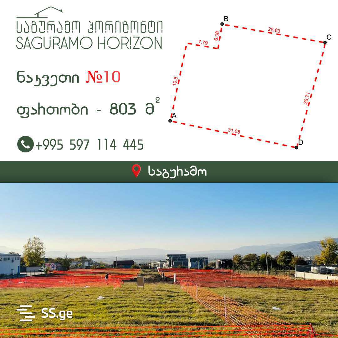 იყიდება Saguramo Horizon-ის 803კვ.მ. არასასოფლო სამეურნეო მიწის ნაკვეთი მშენებლობის უფლებით საგურამოში ცენტრთან ახლოს, ძალიან კარგ ადგილას ხედით კავკასიონზე. ნაკვეთზე ჩატარებულია მიწის სამუშაოები, მიყვანილია კომუნიკაციები: წყალი, ელ. ენერგია და გაზი.