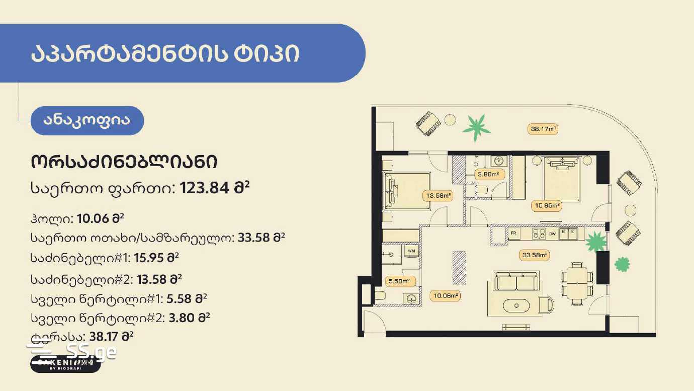 იყიდება! პრემიუმ კლასის მშენებარე ბინა კომპანია ბიოგრაფ ლივინგის პროექტ "საკენში" 123.34 კვ.მ. - აპარტამენტი "ანაკოფია".