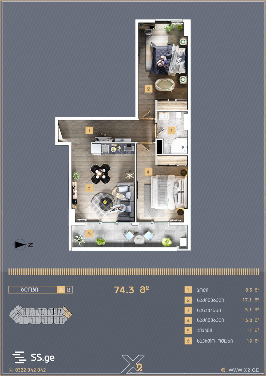 74.3 მ²ოთახი