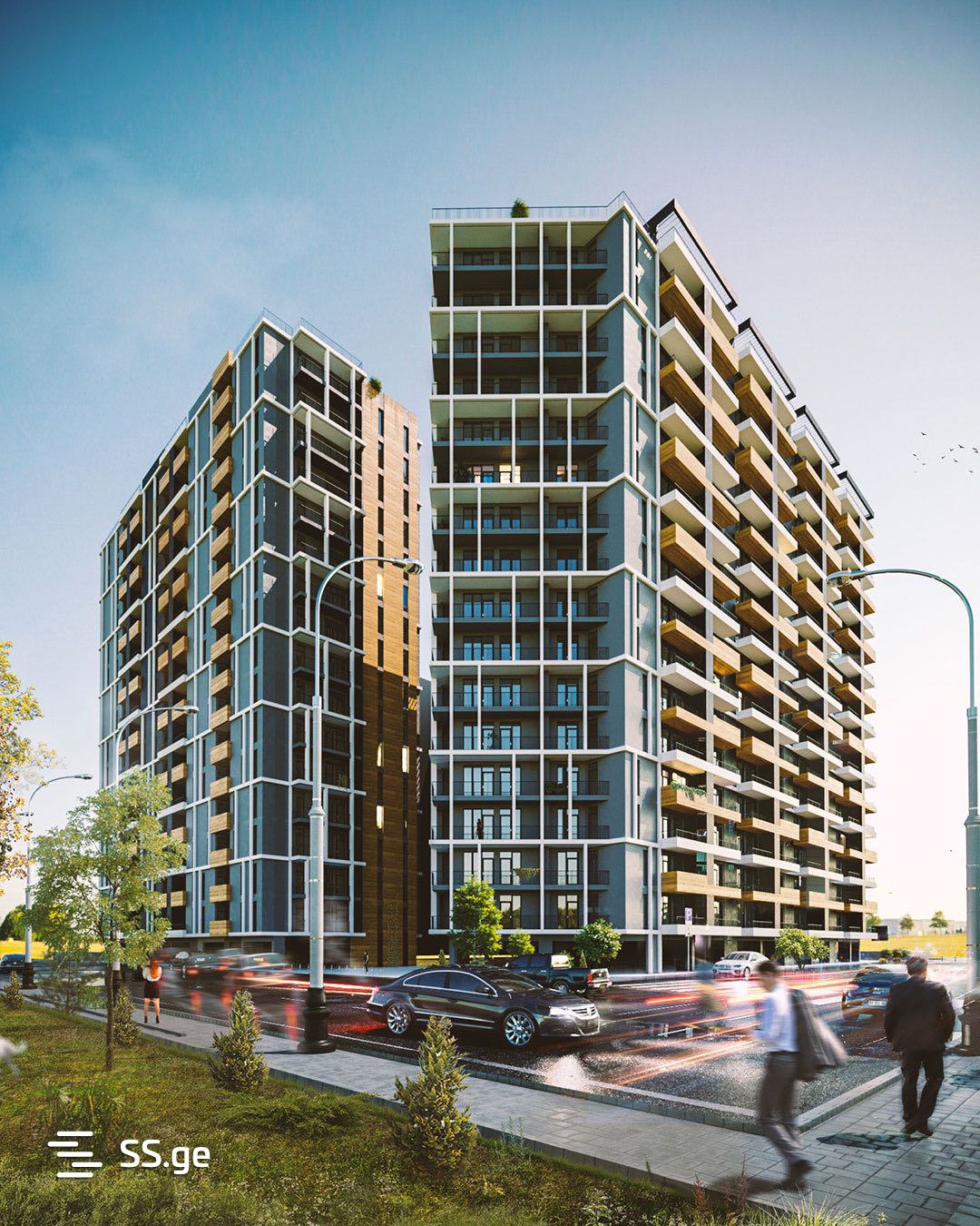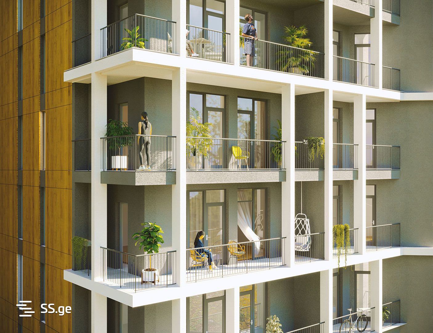 შენობის ფასადი მოპირკეთდება კომპოზიტური ხის ფაქტურის პანელებით. ვიტრაჟულ ნაწილს შეადგენს შავი ფერის მეტალო-პლასტმასის კარ-ფანჯარა. აივნებზე დაიგება ყინვაგამძლე ფილები.