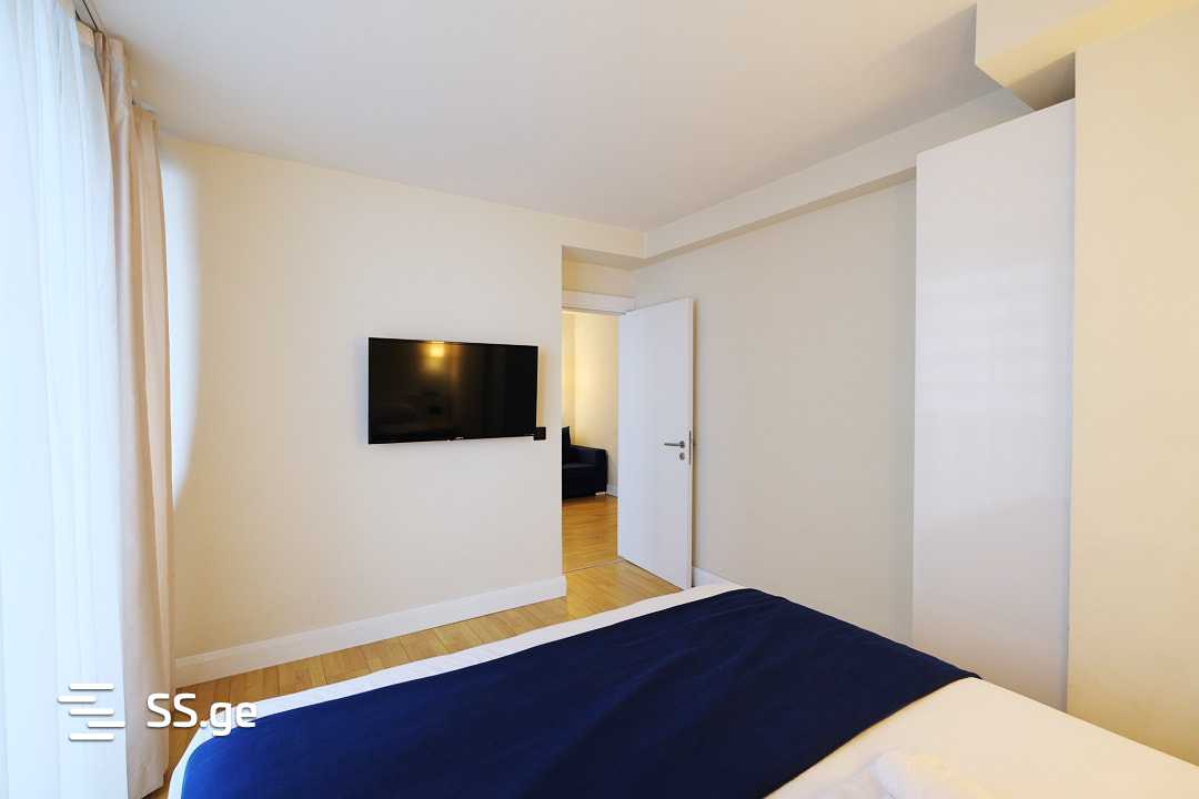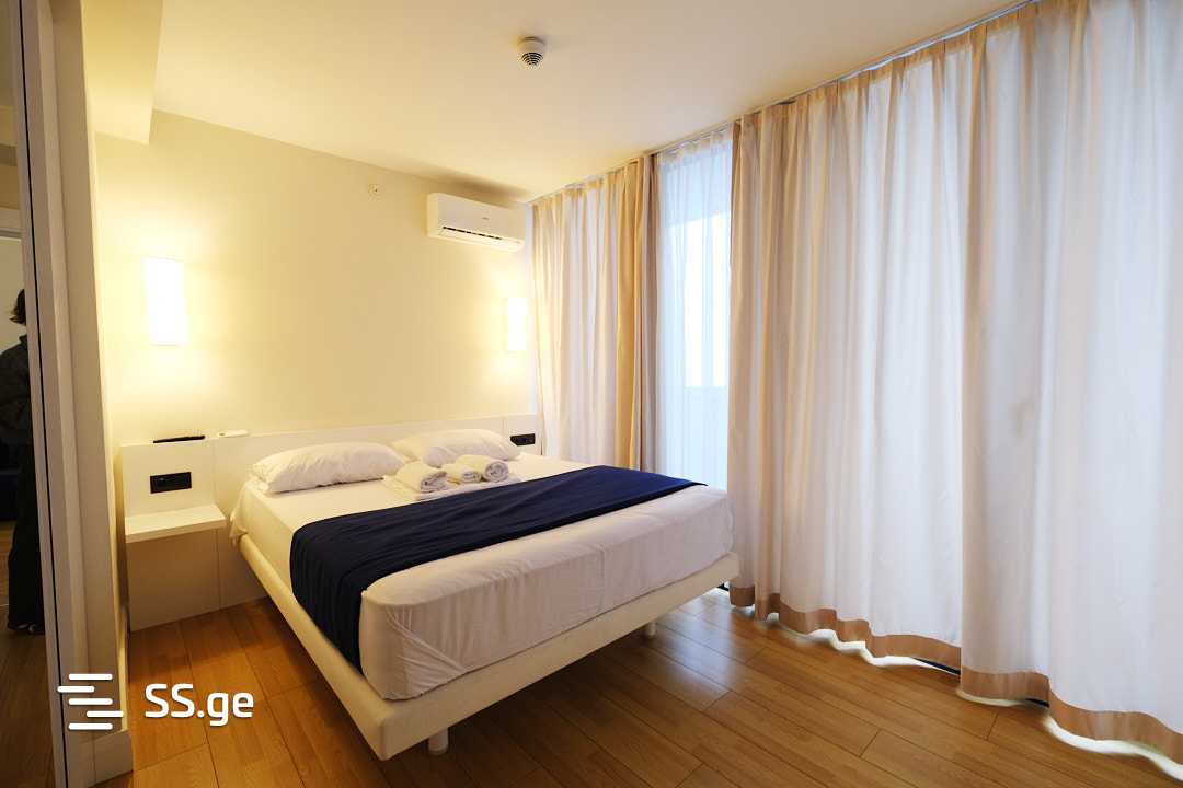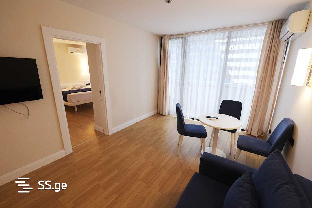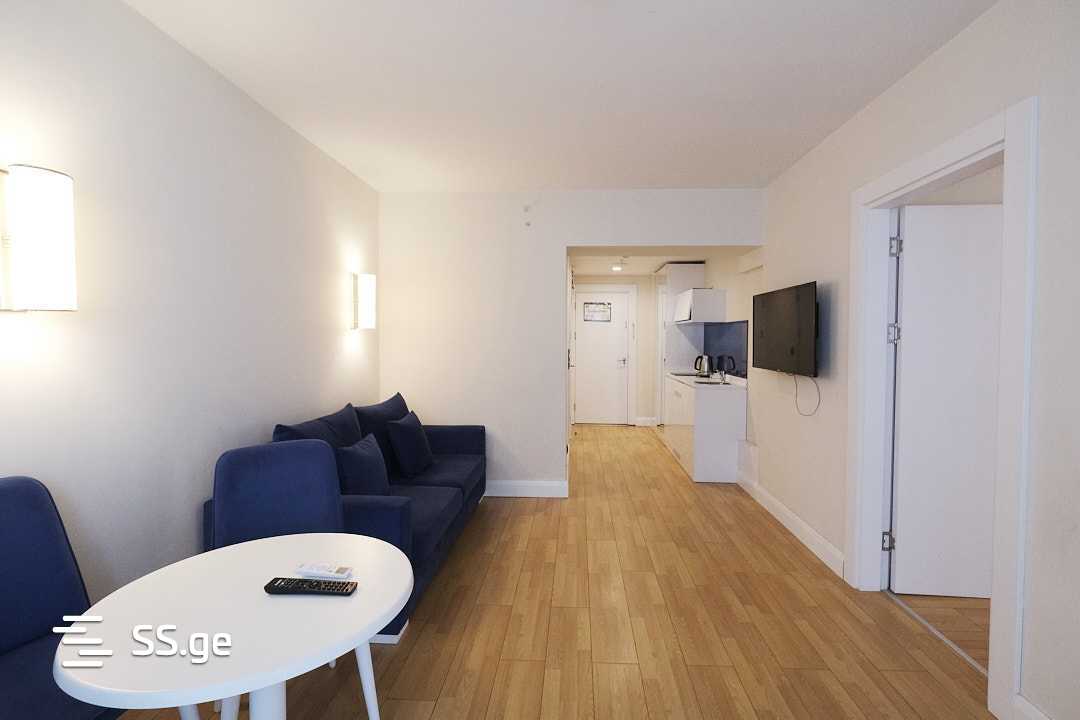 ბინას აქვს ცალკე საძინებელი, სტუდიოს ტიპის მისაღები ოთახი და სამზარეულო, სრული ავეჯი და ტექნიკა: დივანი, საწოლი, სასადილო ზონა, ორი ტელევიზორი, კონდიციონერი, სარეცხი მანქანა, თეთრეული, ფენი, ჭურჭელი — ყველაფერი გათვალისწინებულია.