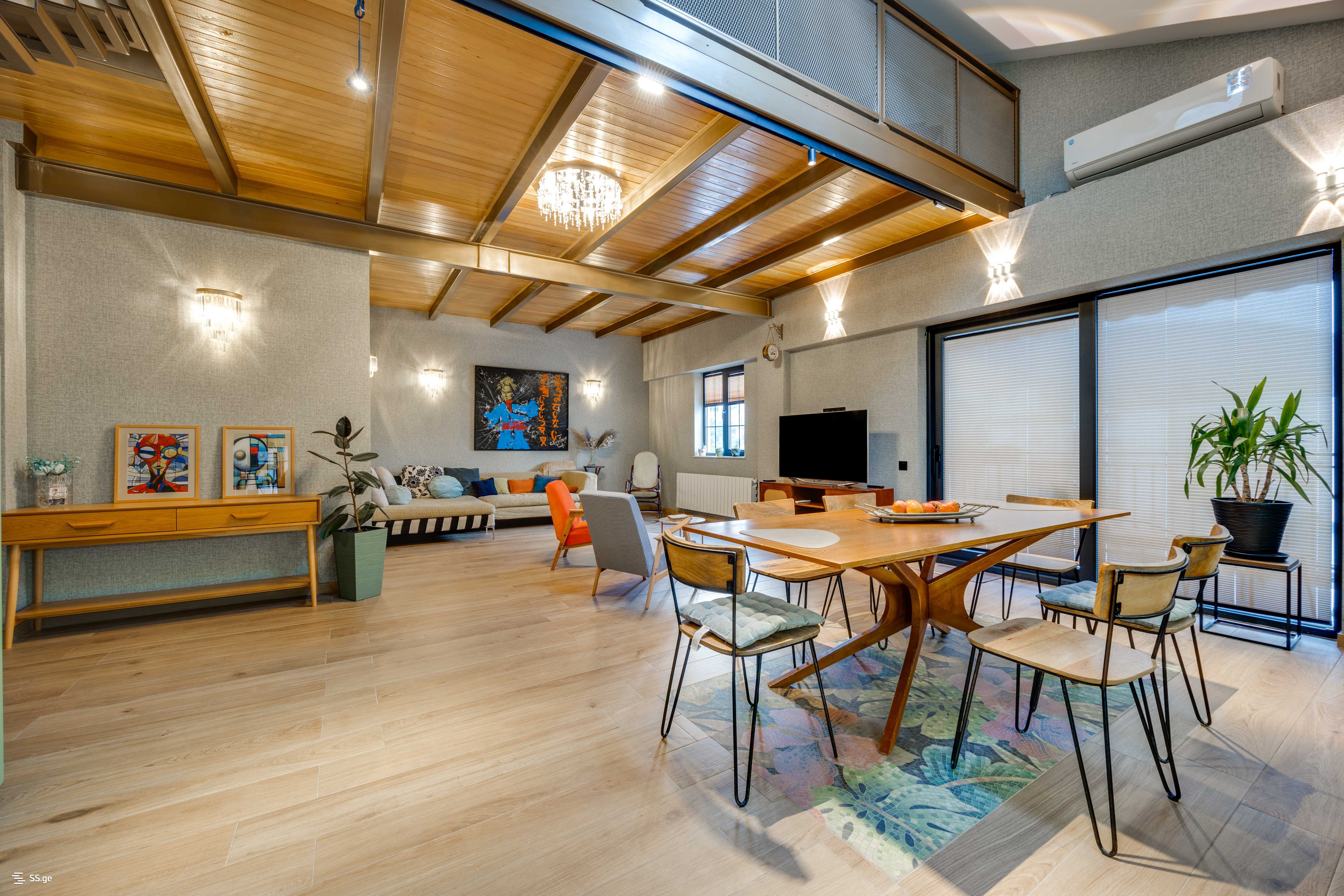 ბინის განლაგება შემდეგნაირია: პირველი სართული: 99კვ.მ. მისაღები ოთახი და სამზარეულო, სველი წერტილი, ტერასა, საძინებელი საკუთარი სველი წერტილით და აივნით. მეორე სართული: 57კვ.მ საძინებელი სათავსოთი და საკუთარი სველი წერტილით და ტერასა.