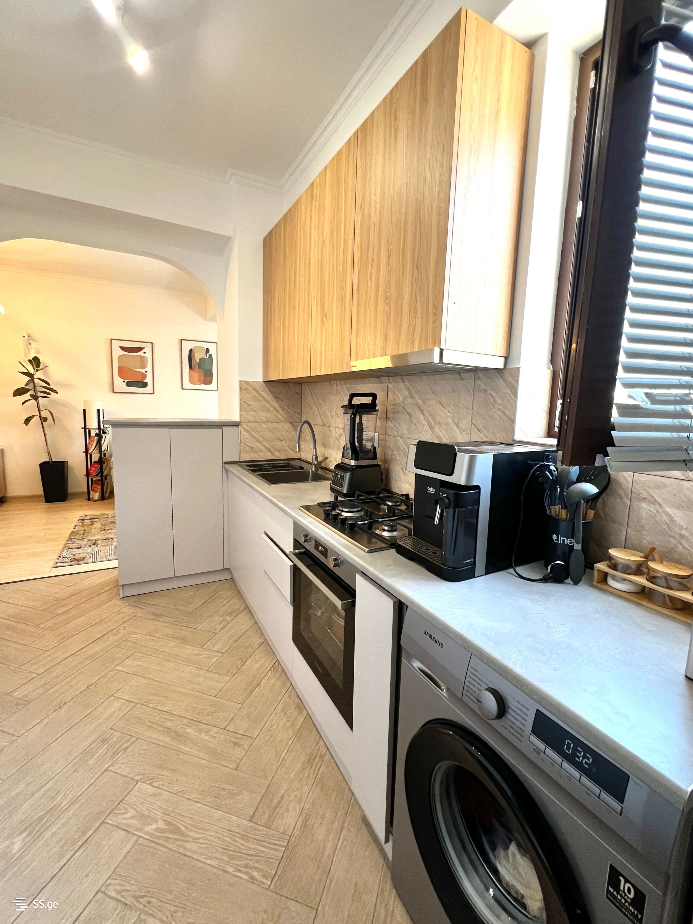 რაც ძალიან მნიშვნელოვანი და ხაზგასასმელია, სამზარეულო არის გამიჯნული და აქვს საკუთარი ფანჯარა, ასევე ბინაშია საკუჭნაო ფართი და 𝟐კვ.მ ფრანგული აივანი სარეცხის კომფორტულად გასაშრობად.