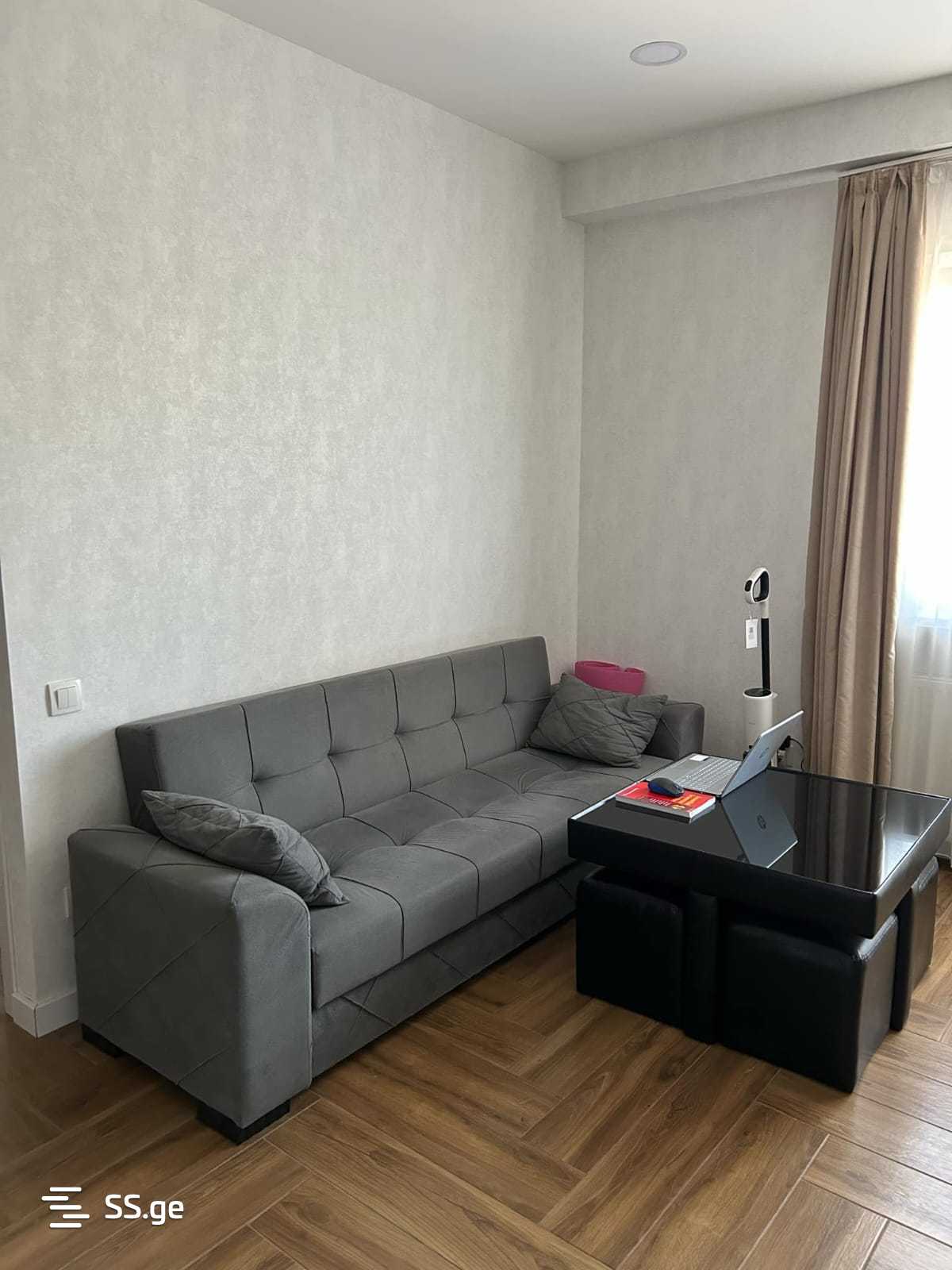 ყავის მაგიდა და პუფები, გასაშლელი დივანი სათავსოთი, სმარტ ტელევიზორი, ტელევიზორის მაგიდა, კონდიციონერი გატბობა გაგრილების სისტემით.