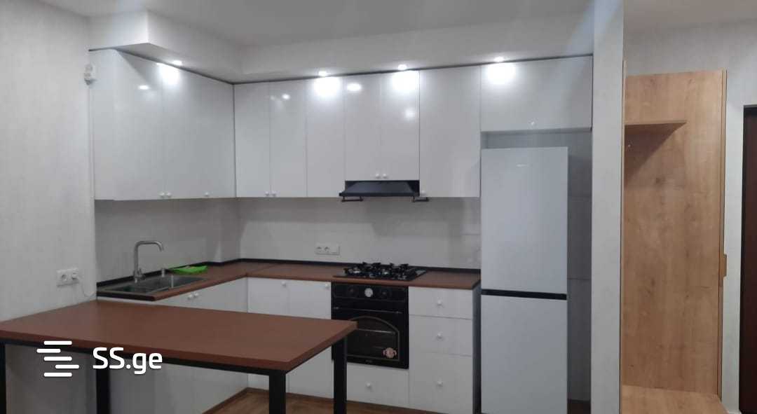 ბარის მაგიდა და სკამები, ჩაშენებული სამზარეულოს კარადა, ჩაშენებული გაზი, გამწოვი და ღუმელი, მაცივარი, შემოსასვლელის კარადა