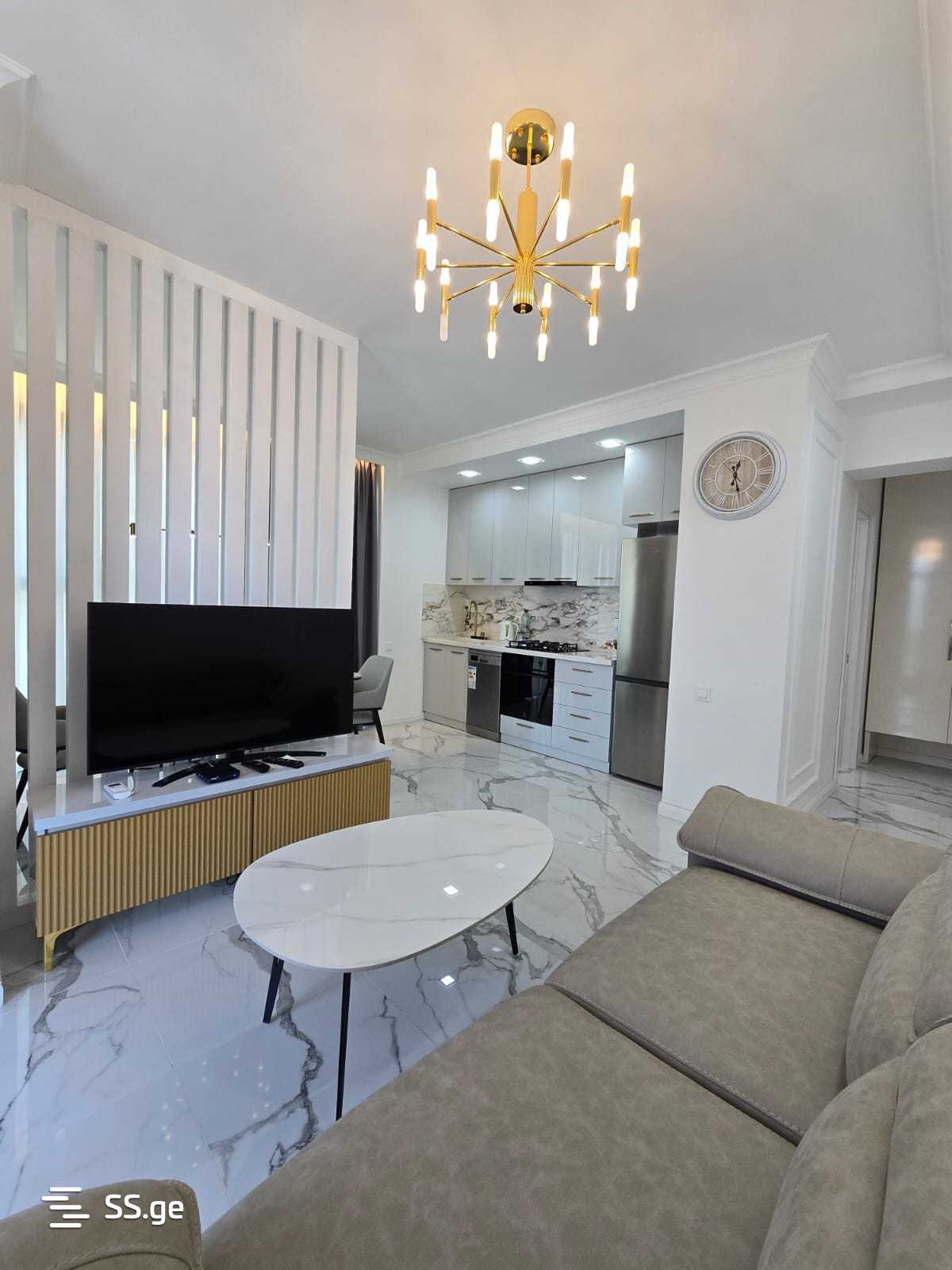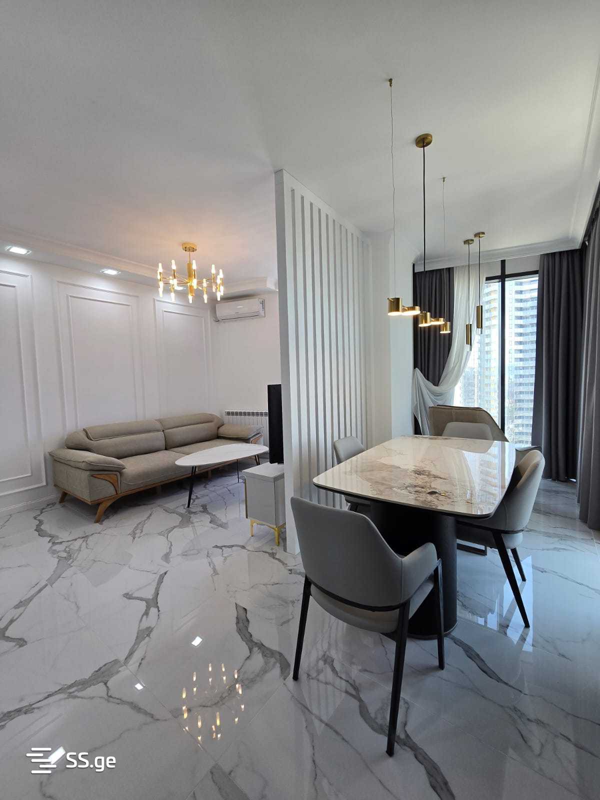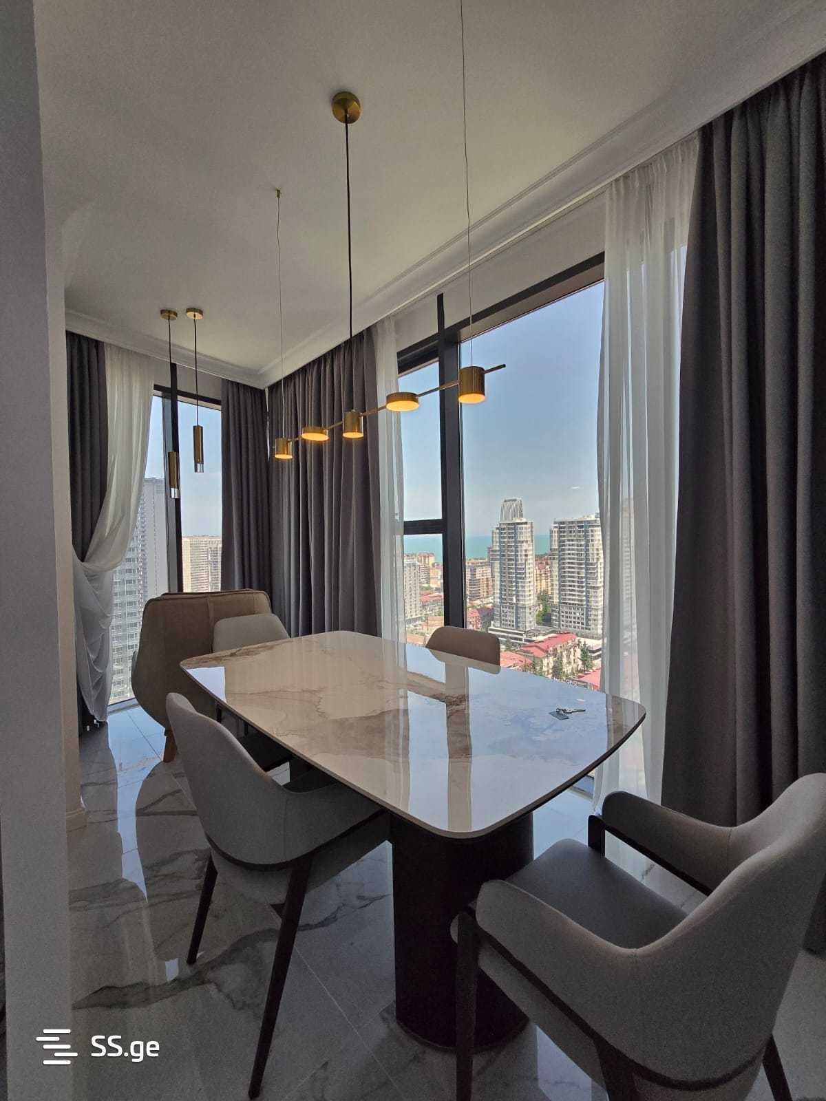 სამოთახიანი დიდი (97 კვ.მ) გამჭოლი, ნათელი პრემიუმ კლასის ბინა ლამაზ თანამედროვე რემონტით და ავეჯით. დიდი აივნებით - ზღვის , ქალაქზე და მთების ხედით.