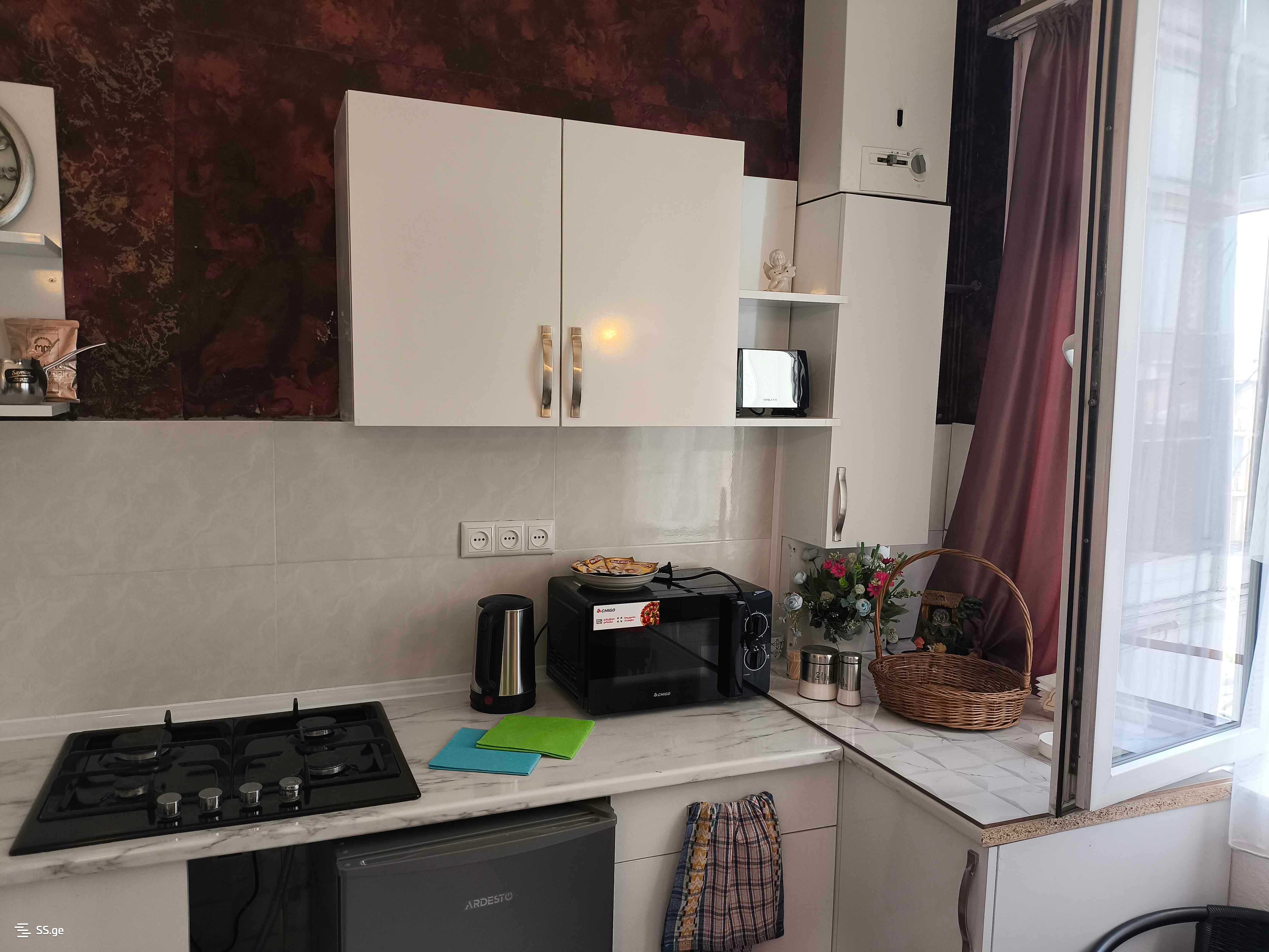 კეთილმოწყობილი სტუდიოს ტიპის ბინა, რომელიც მდებარეობს მეტრო "300 არაგველთან" 2 წუთის სავალზე, მყუდრო და მშვიდ უბანში. ბინაში არის ცალკე სამზარეულო გაზის ქურით, მაცივრით, მიკროტალღური ღუმელითა და საჭირო ჭურჭლით. საძინებელი ზონა მოწყობილია კომფორტული საწოლით, ტელევიზორითა და განათებით. აბაზანა კაფელ-მეტლახით, აღჭურვილია უნიტაზით, ხელსაბანით და სარეცხი მანქანით.