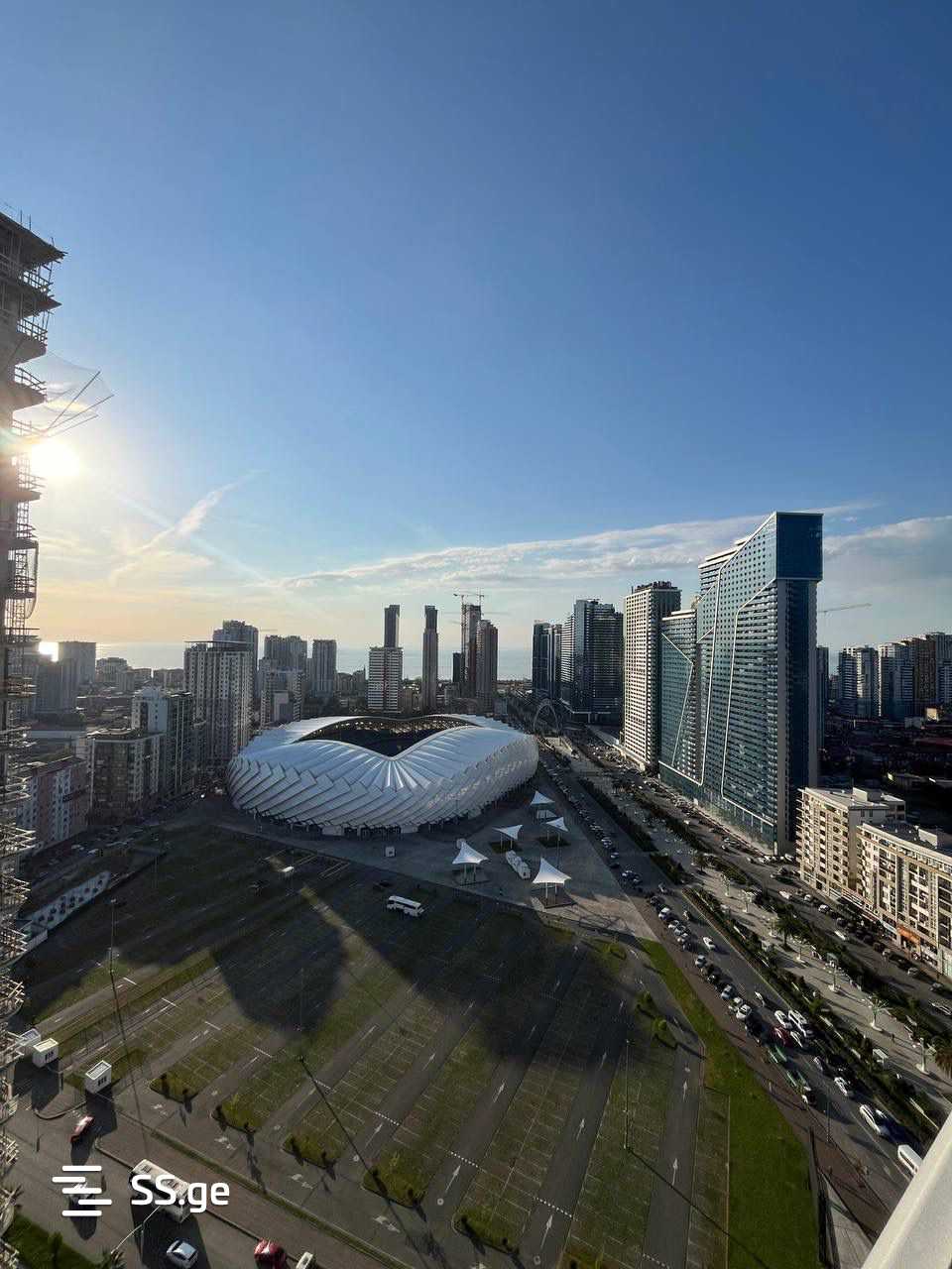 იხიდება ბინა ქალაქის, ზღვისა და მზის ჩასვლის პანორამული ხედებით.