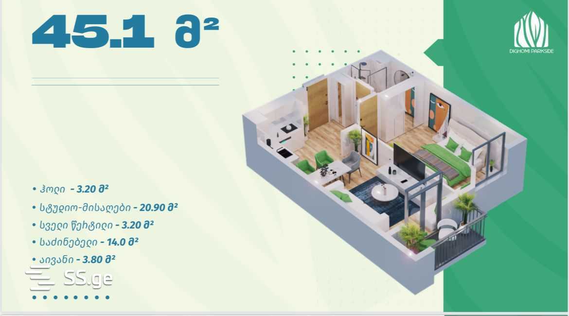 📏 45.1 მ² | 1 საძინებელი | 1 მისაღები | ცალკე სამზარეულო | 1 სველი წერტილი | აივანი