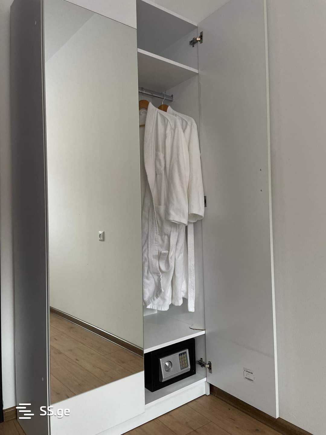 ავეჯი: სამზარეულოს კუთხე, დივანი, საწოლები მატრასებით, სამზარეულოს მაგიდა, სკამები, ტანაცმლის კარადა, სამუშაო მაგიდა საძინებელში, აივნის ავეჯი
