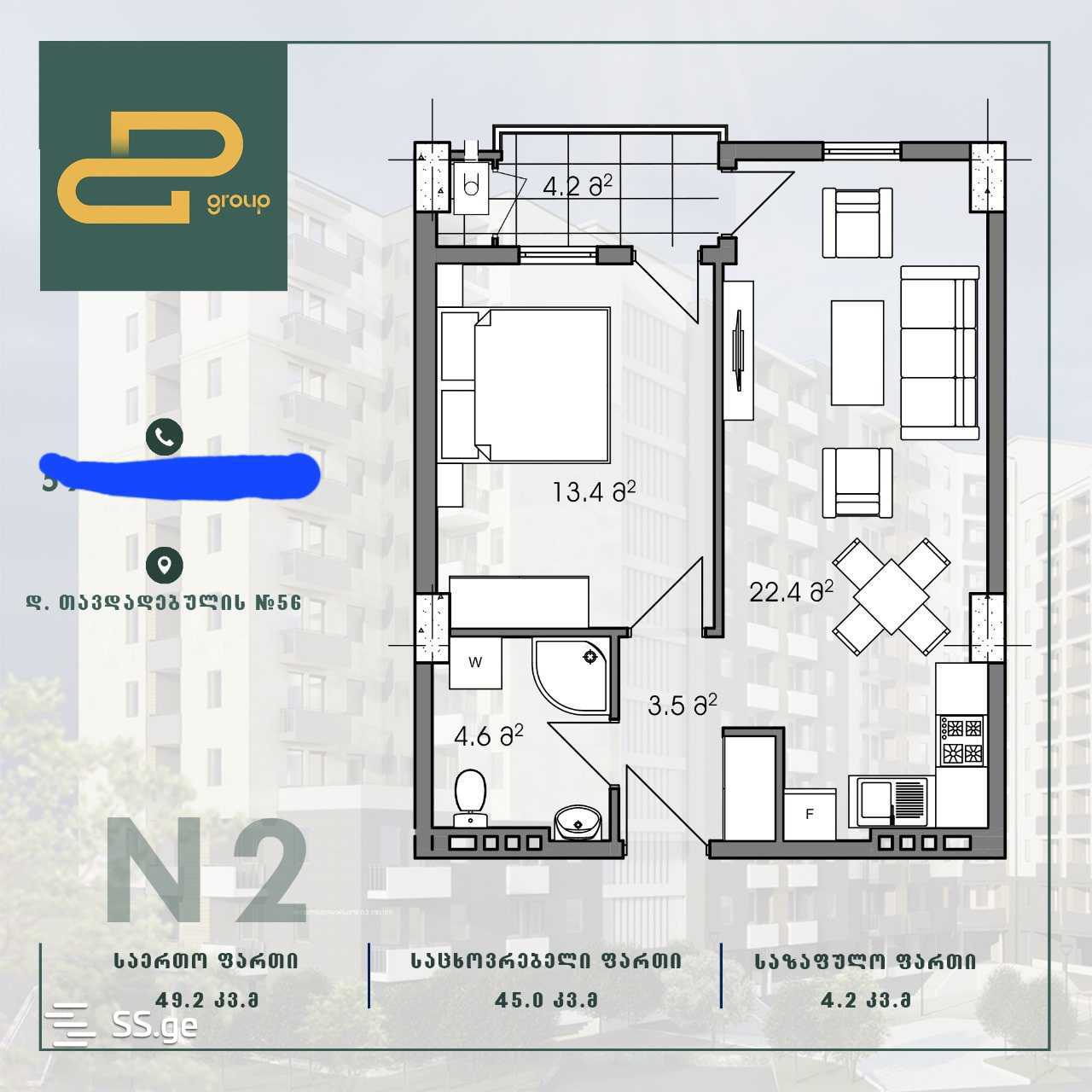 იყიდება 2 ოთახიანი ბინა დიდ დიღომში