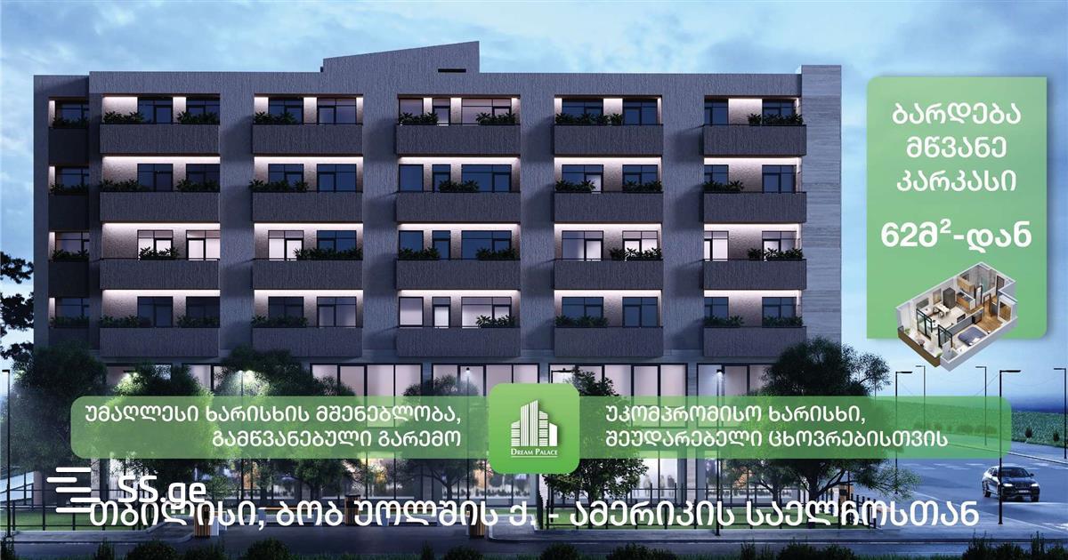 კორპუსი 8 სართულიანია, მშენებლობა მიმდინარეობს თბილისში, ბობ ვოლშის ქუჩაზე ამერიკის საელჩოს გვერდზე, A ბლოკის მონოლითი (კარკასი) დასრულებულია შენობა გადახურულია, მიმდინარეობს გარე ფასადზე მუშაობა, ალუმინის ვიტრაჟების მონტაჟი და შიდა სამუშაოები, ბარდება მაქისმუმ 10 - 12 თვეში მწვანე კარკასის კონდიციაში, ბინები 67 კვ.მ დან - 145 კვ.მ მდე, ფასი 1100$ დან. დეტალებზე შეგიძლიათ ნებსმიერ დროს დაგვიკავშირდეთ