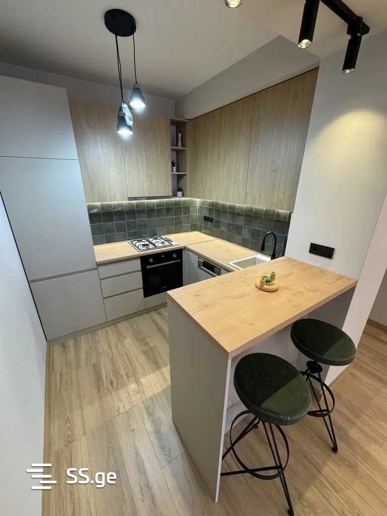 ბინაში არის ბარისა და სამუშაო სივრცე, აივანზე სათავსო.