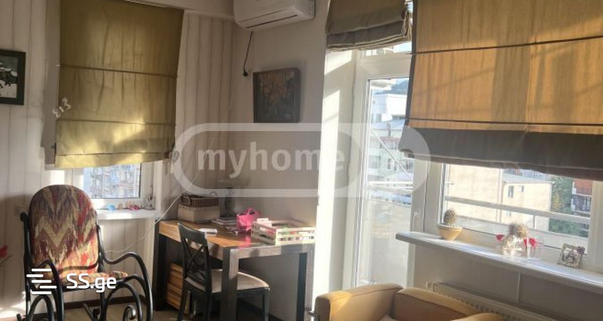 იყიდება სტუდიოს ტიპის ბინა, ლამაზი ხედებით, ორი აივნით, ერთი აივანი ნახევრად დახურულია, სათავსოთი, ბუხრით