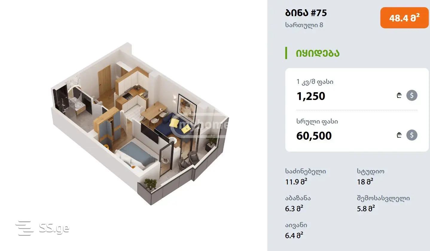 48.4 მ²ოთახი